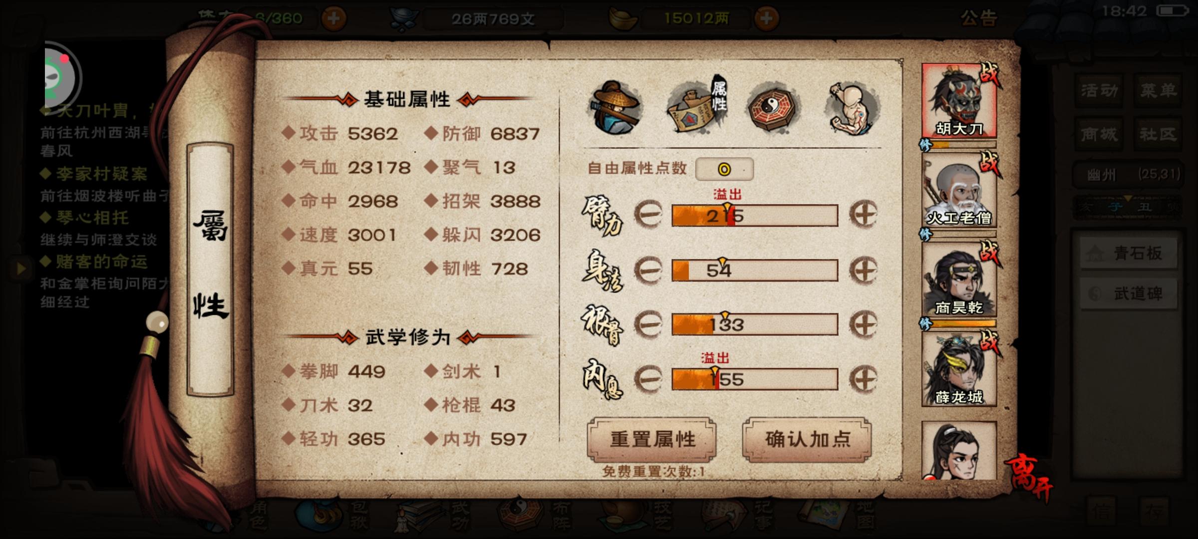 最前言:配合武学介绍篇确定阵容后就可以确定加点了。 前言 加点主要是根据阵容来确定每个人的定位,来确定用什么武功,来确定每个人加点,所以只有确定阵容才能确定加点。 因为前期主角的功法都比野外的快拿到,主角也是要打一部分伤害,所以也是点臂力的。 加点 前排根骨,内息,臂力 后排臂力,身法,内息 这是大方向的加点。 臂力→攻击 所以c都要点臂力 身法→速度,闪避 根骨→气血,韧性 t都要点根骨 内息→