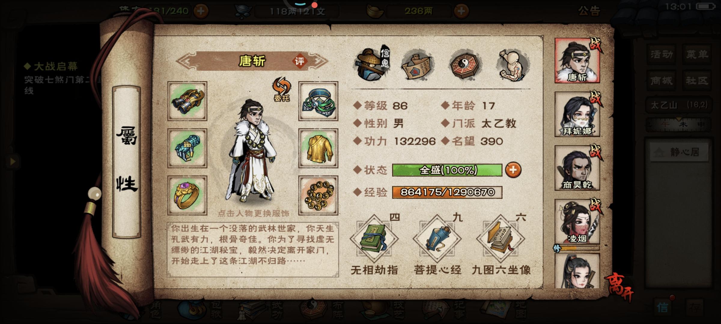 1:目前版本拘魂和六门势力几乎相等,没有明显的强弱 2:新号建议去新区,开局天刀门偷矿和少林藏经阁偷书都相对简单很多,武道也容易上榜 3:新区专属活动寻觅知己,点开右上角活动页面,复制粘贴下面六位字母可以领几千元宝:AAFYFG,烟雨江湖了解一下 4:前期先天天赋可以选闻鸡起舞或者跋山涉水 5:洗髓天赋转世金仙+岿然顶天必备,缺一不可,丹不够就不要洗,最好是一次性洗完,三紫或者四紫 6:太乙少林门