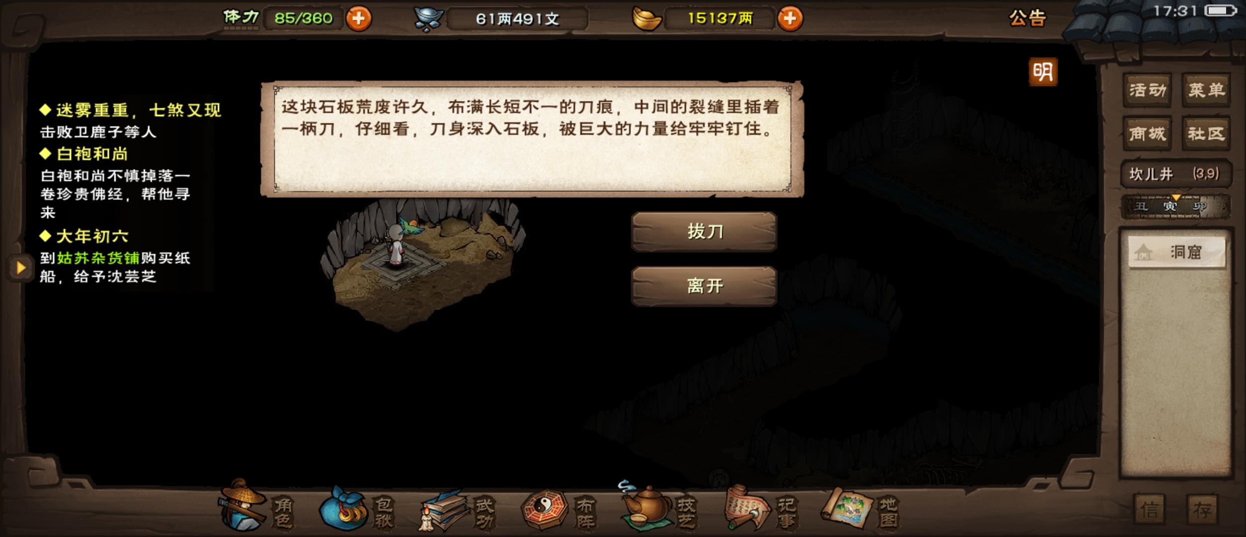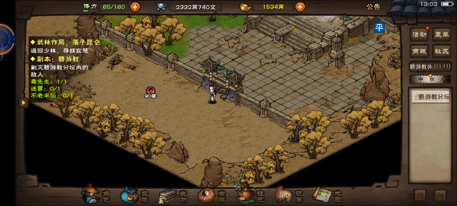 出新手村,首先让一个男随从学铁砂掌,主直接拜师门派,主线拿到点墨。 给人优先选择天刀门,因为天刀的所有门派任务不耗费体力,可以节省。 将以天刀为例,主学满6层的一般武学,加上门派内+气引,吐纳,达成学进阶的条件 随从气引4+吐纳4达成学进阶的条件,基础武学学满,其中两个分别将铁砂掌,点墨学满 之后攒钱,先学轻功,梅花步3层,雁行功9层,水上漂1层。 然后开始拿宝藏, 实测,新手村,南阳度,洛阳(梅