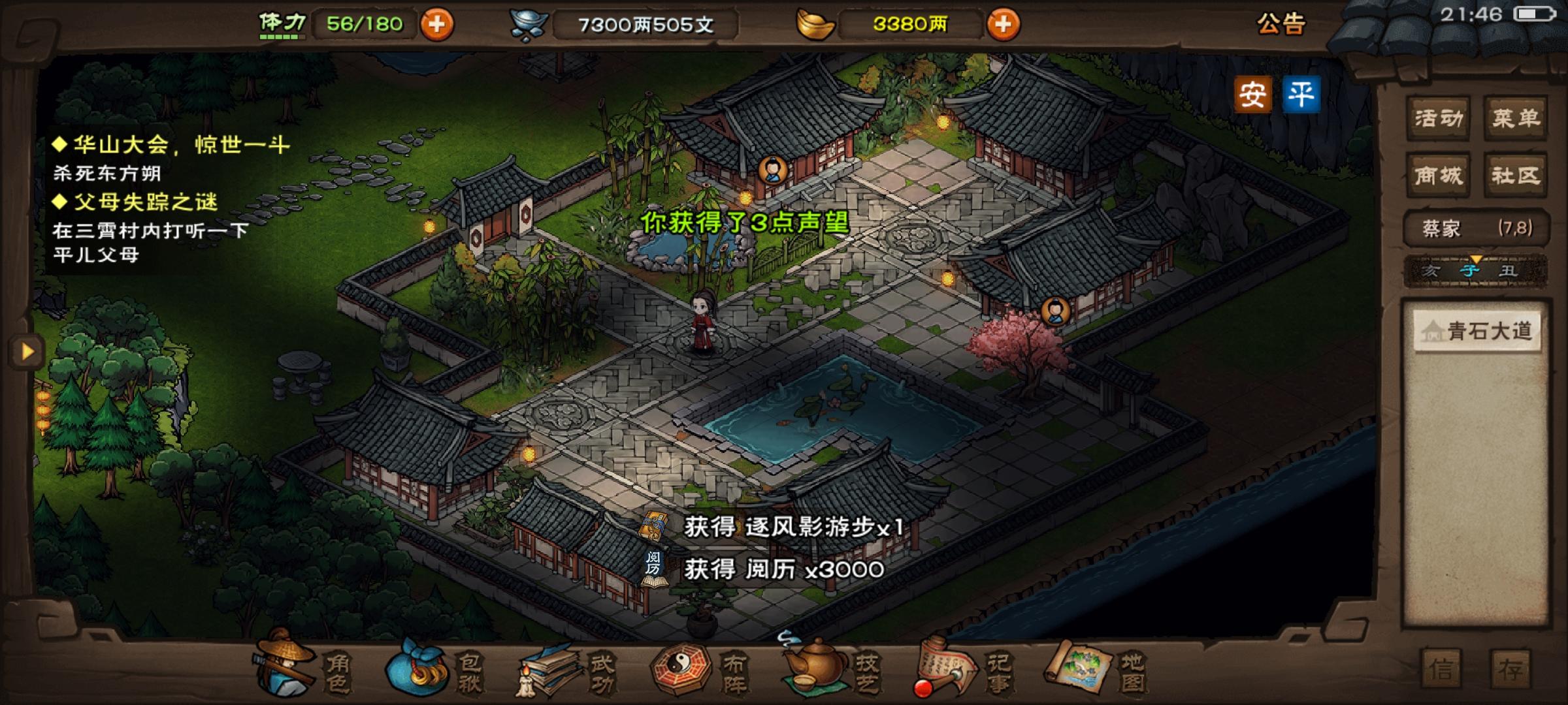 现在主角34岁了,除了收菜也没别的事情做了,就单纯分享一下,也不算攻略 1、开始是在塞北 上线之后领一下月卡,吃满菜,然后刷90级怪刷完体力,主要是为了刷装备卖钱,不然一天下来没多少钱剩下来。如果是晚上的话可以把这里的牛羊宰了 2、幽州 买白芍,刷燕王府(1-2次) 3、泰山 打木人 4、姑苏 枯骨、铁刃门 5、杭州 去书院看看有没有客人 6、泉州 抓鹿、喂鸡、牛 7、龙泉,衡山,南岭一般不去,看