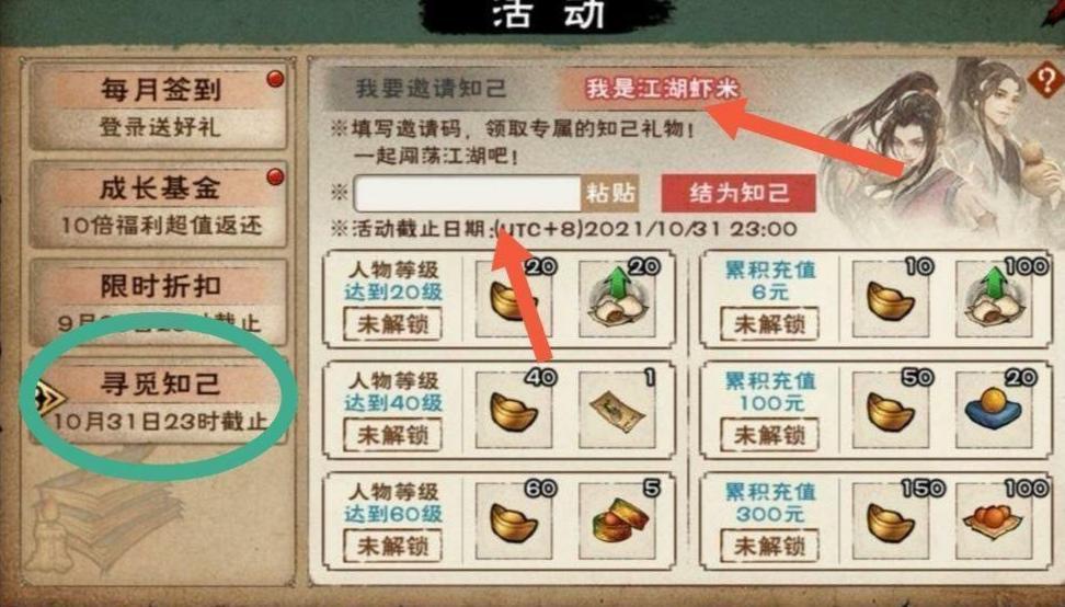 新手福利,游戏右上角点开活动,寻觅知己,然后点开我是小虾米,输入邀请码:ABGUNE可获得400元宝+马车票+8万阅历+120体力+100洗髓丹+20顺脉丹。