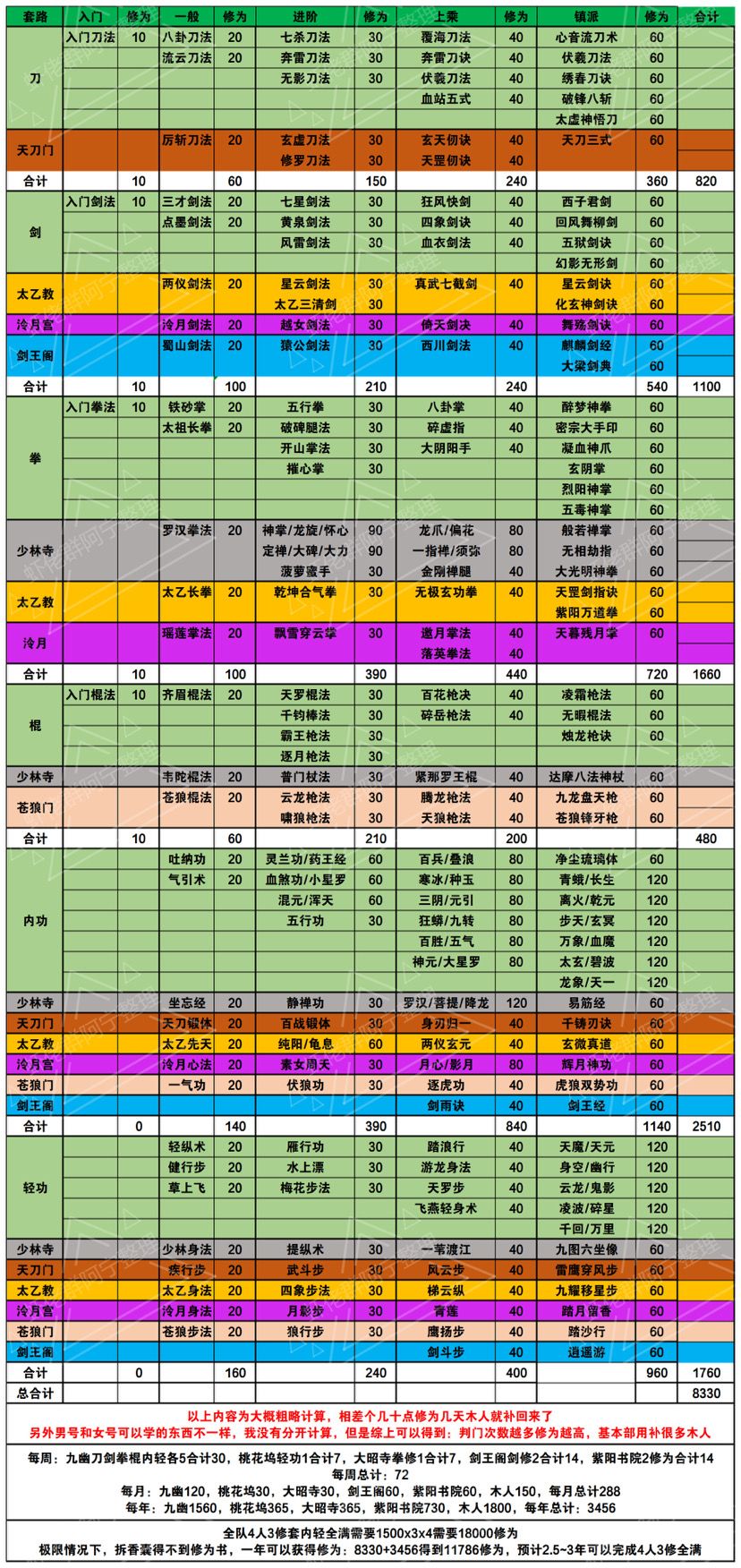 3.门派贡献特别重要,一般情况下不随便花贡献,甚至为了节约贡献可以不学武学(后面武学我都改口为套路)/内功/轻功直接出师,只要能满足出师要求就行,尤其是轻功,能不学就不学。退出门派贡献清零。因此在退出门派之前把贡献花完。