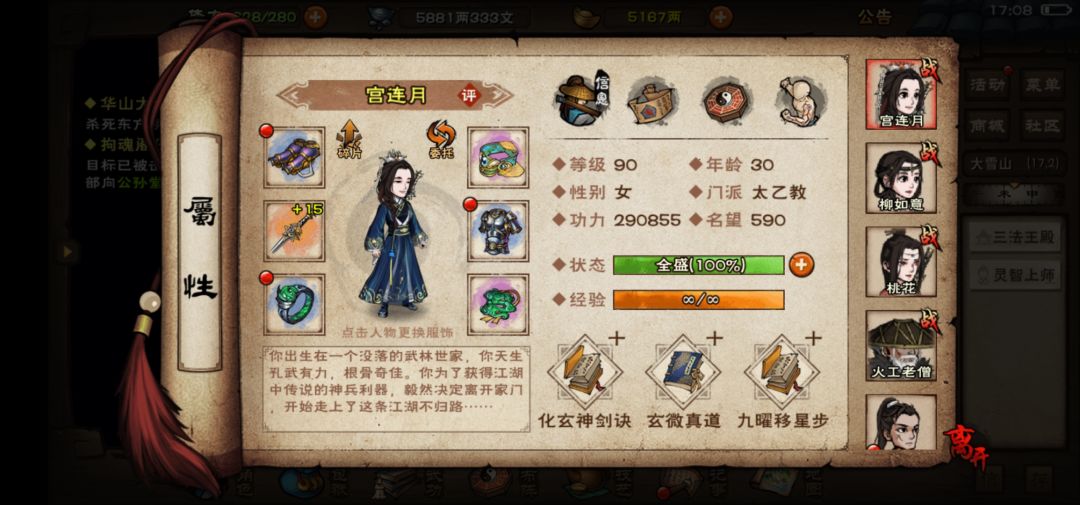 苏念雪(优势女,剑随从,正常情况下一两天之内会获得点墨剑法,很重要,给她学,且苏念雪淘汰的时候可将剑法传功给其他角色加剑修,不用担心浪费。)