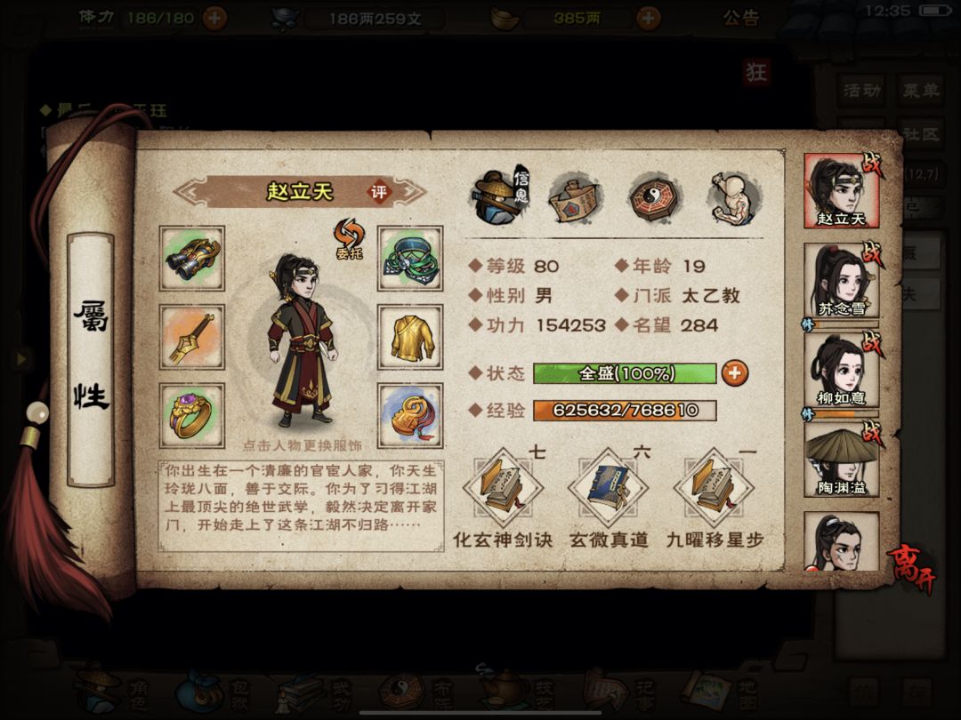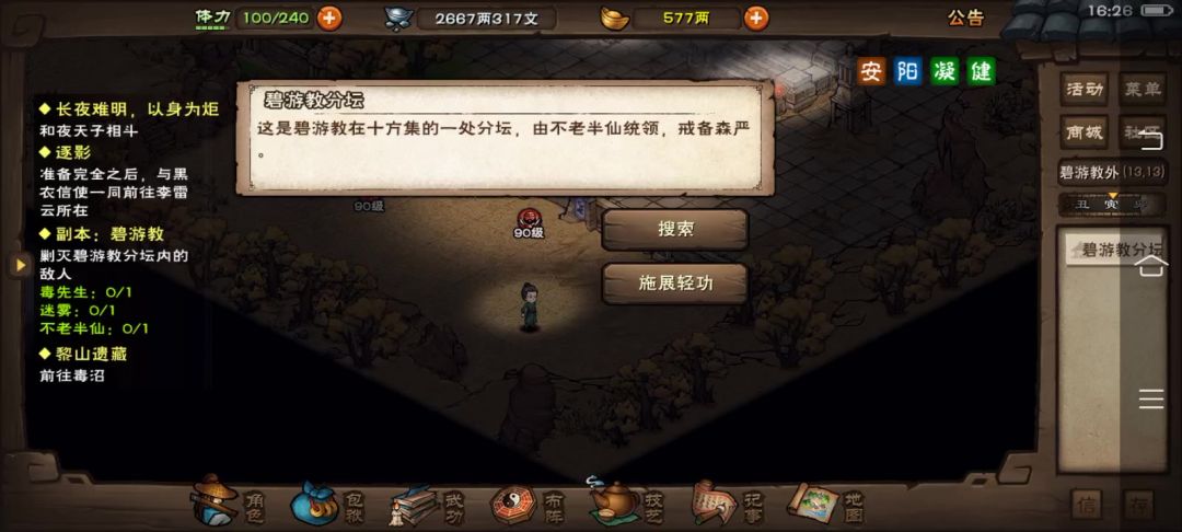 出新手村,首先让一个男随从学铁砂掌,主直接拜师门派,主线拿到点墨。 给人优先选择天刀门,因为天刀的所有门派任务不耗费体力,可以节省。 将以天刀为例,主学满6层的一般武学,加上门派内+气引,吐纳,达成学进阶的条件 随从气引4+吐纳4达成学进阶的条件,基础武学学满,其中两个分别将铁砂掌,点墨学满 之后攒钱,先学轻功,梅花步3层,雁行功9层,水上漂1层。 然后开始拿宝藏, 实测,新手村,南阳度,洛阳(梅