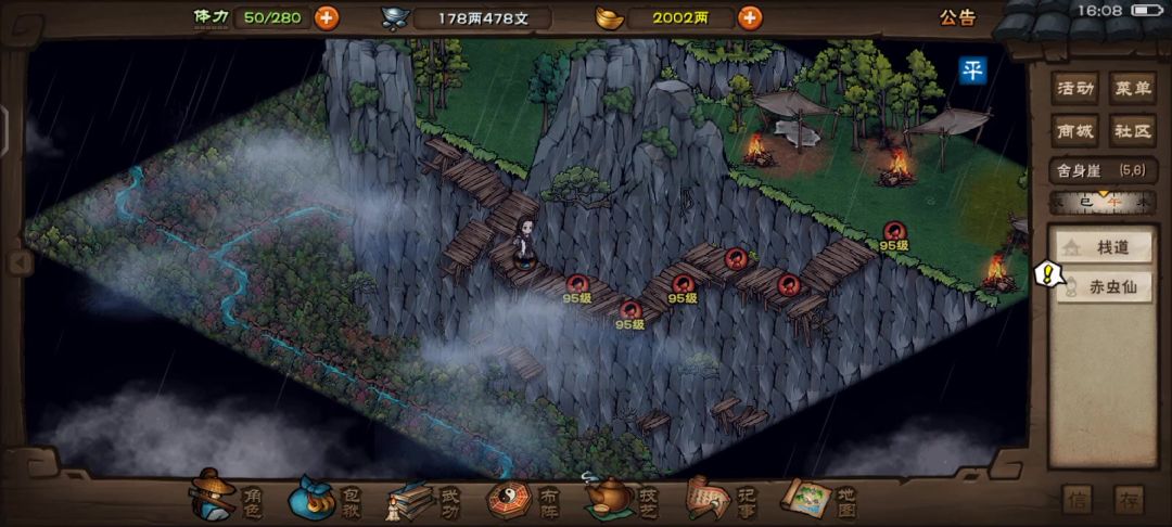 烟雨江湖中天刀并没有偷秘籍的玩法,能偷秘籍的是少林寺的藏经阁,玩家等级到40级,就可以用轻功跳到藏经阁顶,然后钻小窗进去,五个书架选一个“搜索书架”就可以偷取秘籍残页。 天刀没有偷秘籍,但是可以偷矿,进入落霞镇东北角(40,3)这里的矿洞,点击矿洞里的矿脉,再点击“私自开采”就会触发战斗,打败守卫就可以偷矿了,不过守卫很难打。 原帖