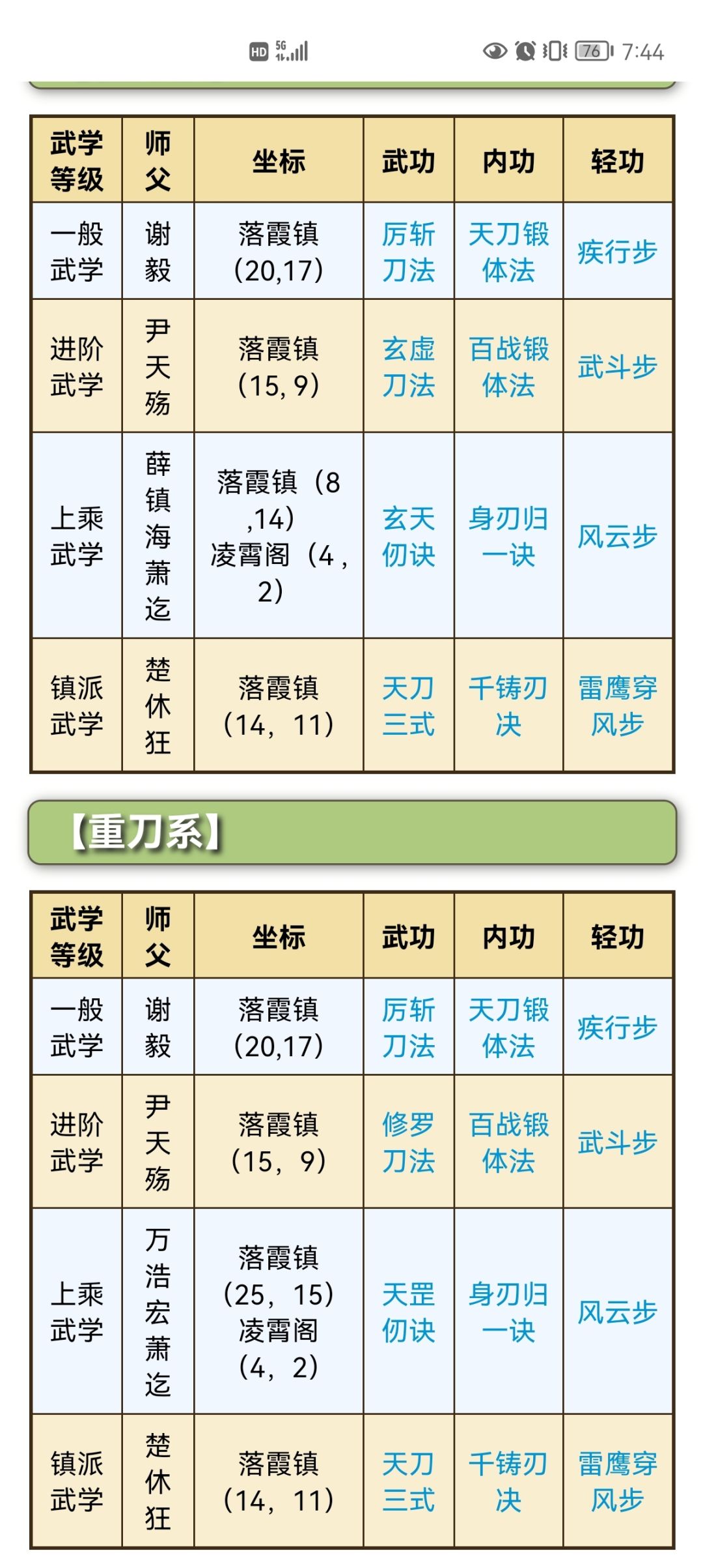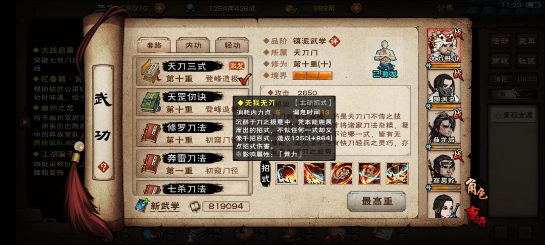 一般 厉斩刀法 天刀锻体法 疾行步 进阶 玄虚刀法 修罗刀法 百战锻体法 武斗步 上乘 玄天仞诀 天罡仞诀 身刃归一诀 风云步 镇派 天刀三式 千铸刃诀 风雷穿鹰步(雷鹰穿风步)