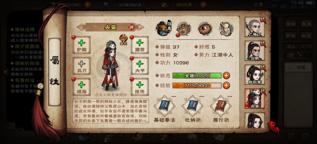 1. 选用南阳老中医更划算 在刚开始创角时,如果受到伤害,建议选择在南阳老中医那治疗,因为那里的治疗费用相对便宜,能有效降低前期的开支。 2.柳如意寻药王经的建议 找到药王经上册的柳如意后,千万不要自己学习,否则后续招募柳如意时会增加不少成本。 3.轻功技能优化建议 建议轻功随从全部学习梅花步法,因为可以减免伤害。主角入门派免费获得轻功后,优先学习健行步和轻纵术,轻功等级快速达到20后,就能解锁进