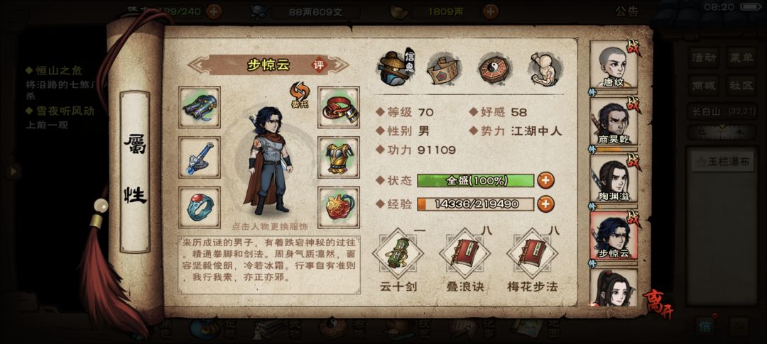 刚拿到云十剑,同样用步惊云开荒的后来人需要注意以下两点 1.在步惊云70级的时候主角68级,正常情况下玩家战力应该在35万左右,升级快的会更低,加上等级压制是很难打的过大雪山80级野怪,这个时候可以用大雪山的守矿怪来触发任务,难度低很多,注意不要提前打了。 2.步惊云武学升级任务练丹需要150级炼丹术加灵兰功,提前准备,文皇经300的话练跌打药很简单就刷到了