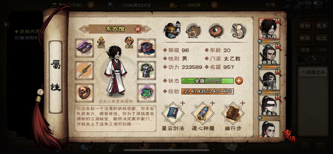 我的邀请码AAFYFG,以下是萌新40级前可以做的事: 10级: 武馆指点 初级 (3回合内获得4000阅历) 加入门派少林寺(仅男),泠月宫(仅女),太乙教,天刀门,苍狼门 学习垂钓,炼丹,道学,佛法,音律,冰心诀,烹饪各种技艺。(请移步技艺与秘技) 非泠月宫弟子可以通过赠送礼物,开启泠月会友阁商店。 20-30级: 副本 聚仙寨 (洛阳府尹进入) NPC挑战洛阳(6.3)周石天,概率