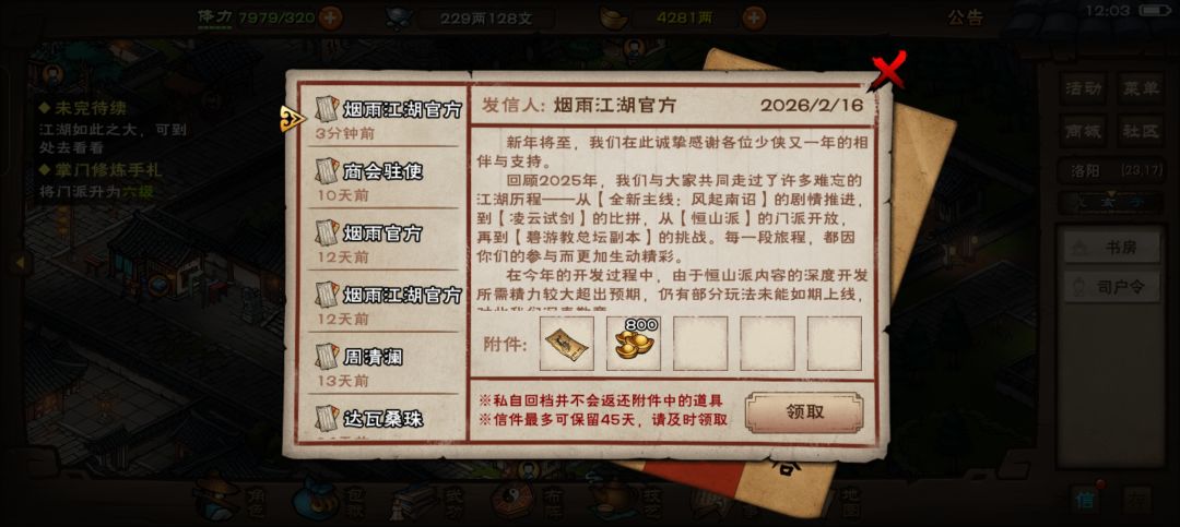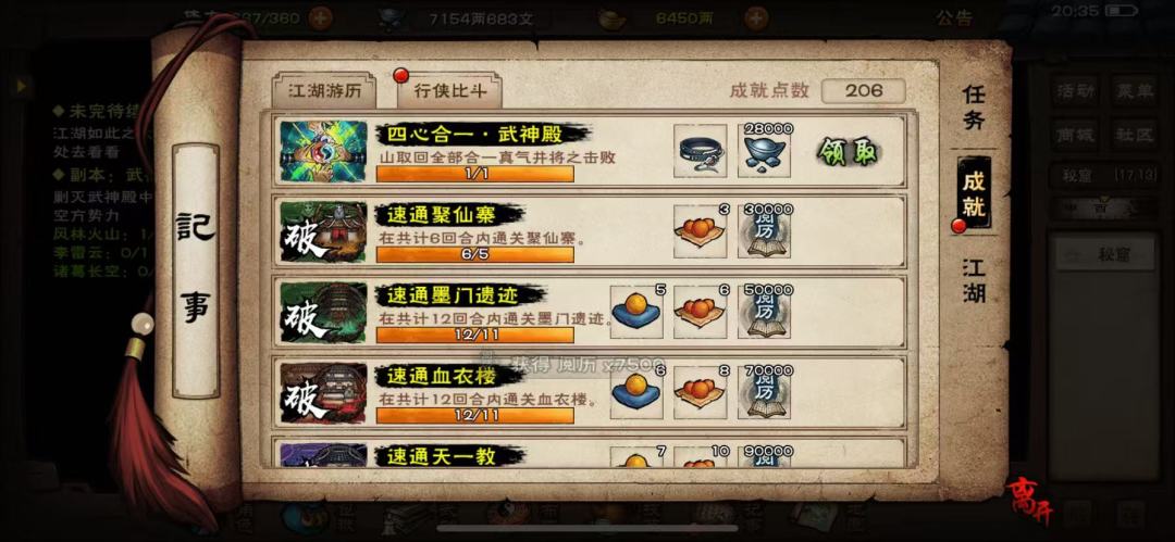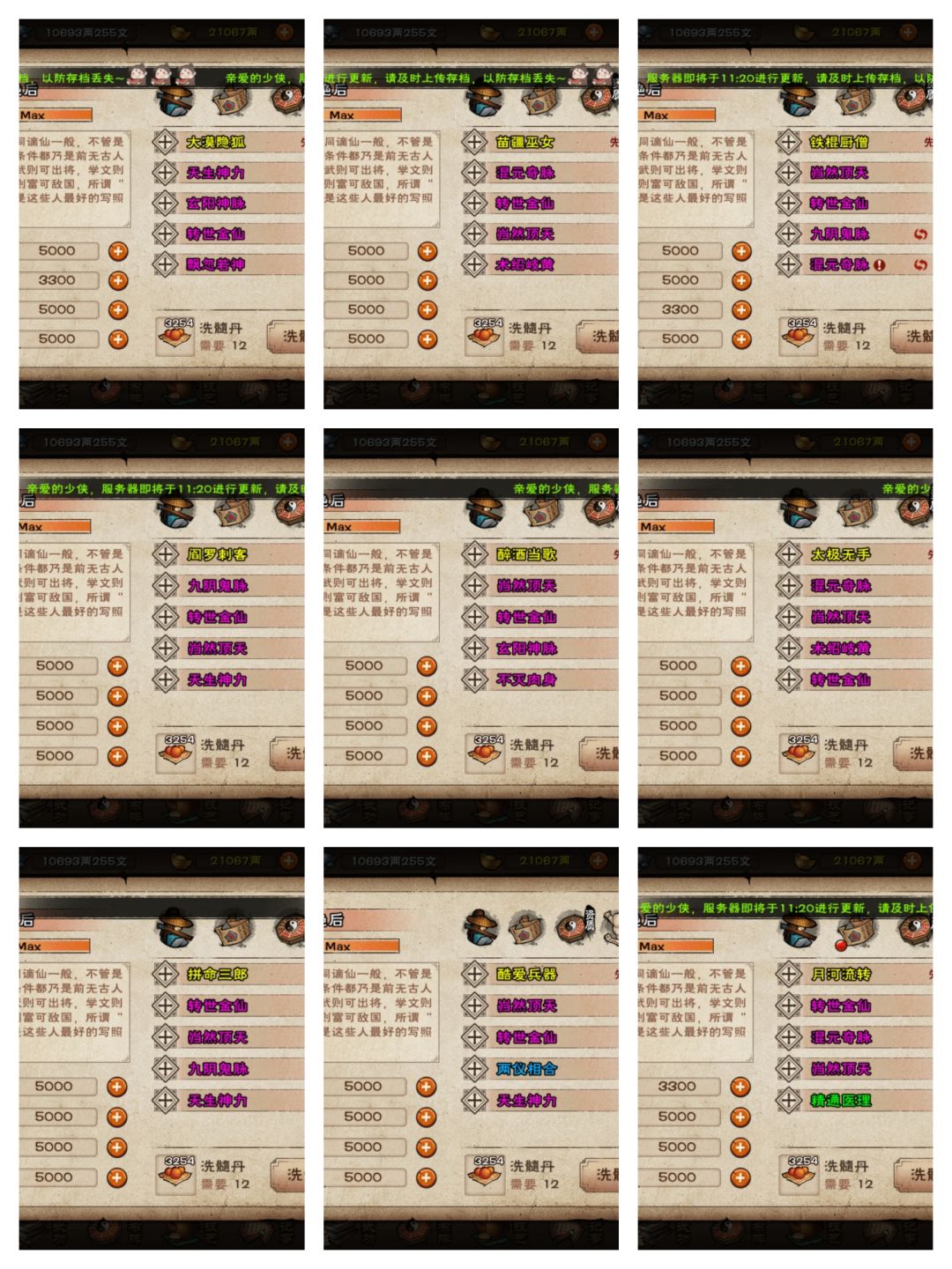 开荒小提示 1.开局后在忘忧村主线结束后立刻去获取铁砂掌并且升级到5层,解锁眩晕【学后不可传功,谨慎选择,打九幽可用】 2.在南阳渡主线结束后立刻去获取点墨剑法并且升级到7层,解锁点穴 3.请尽快!优先!火速!学习雁行功并且升级到9层解锁二段跳跃,同时学习水上漂[可以不升级],后面文皇经【前期必拿】和一些宝藏需要。 4.在完成3的期间每天购买文房四宝和麻绳,(主角30级),雁行9层并且学习水