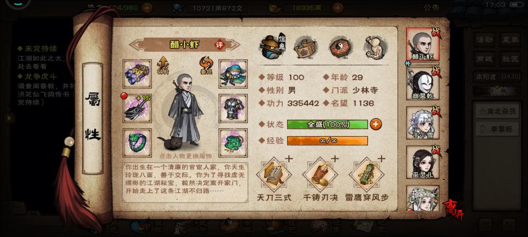 本攻略为男号攻略 一.开局天赋选择:跋山涉水或酷爱兵器,个人推荐男号,大势力选择拘魂阁,开局随从选苏念雪(跋山涉水可以是输出主也可以是肉主,酷爱兵器只能当输出主,后期可以弄先天丹更换天赋)。 二.兄弟们咱们也是成功到忘忧村了,忘忧村,毓秀山张(26.15)触发铁砂掌支线,氪金的推荐给商或者火工老僧,不氪金的推荐给陶,做完南阳主线,找裘啸天打听孙邪,泰安镇击杀孙邪搜身获得点墨剑法,主角优先升级雁