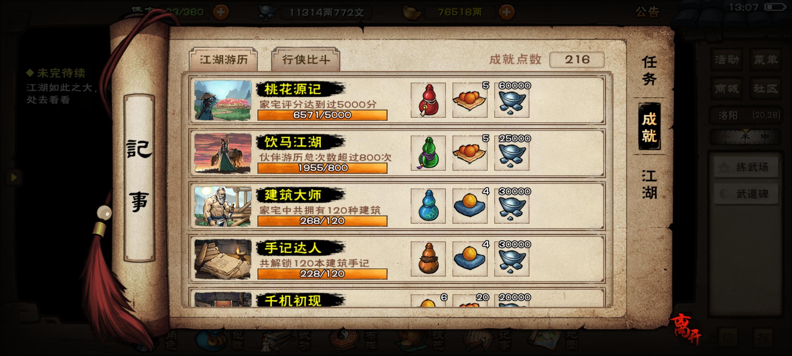 1、桥上钓鱼,需要钓锦鲤,总共可以钓上来3次,共10个烟雨币 2、酒楼,掌柜打听桂花酒,可以预定10瓶桂花酒,下一次庙会开启时可以拿出来,每瓶可以升一级酒艺(100级前) 3、酒楼打听除夕团圆饭,任务后获得50烟雨钱,然后再去酒楼后面祈福树祈福,可以获得100烟雨钱 4、在(7.8)(10.6)(15.5)(22.5)可以获得烟雨钱