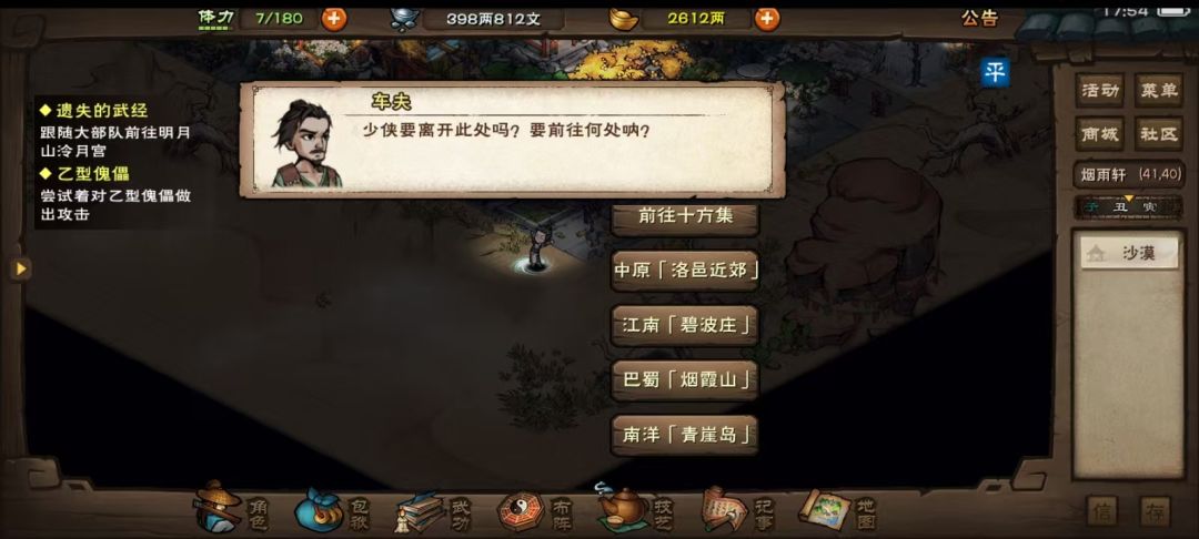 本攻略为男号攻略 一.开局天赋选择:跋山涉水或酷爱兵器,个人推荐男号,大势力选择拘魂阁,开局随从选苏念雪(跋山涉水可以是输出主也可以是肉主,酷爱兵器只能当输出主,后期可以弄先天丹更换天赋)。 二.兄弟们咱们也是成功到忘忧村了,忘忧村,毓秀山张(26.15)触发铁砂掌支线,氪金的推荐给商或者火工老僧,不氪金的推荐给陶,做完南阳主线,找裘啸天打听孙邪,泰安镇击杀孙邪搜身获得点墨剑法,主角优先升级雁行功