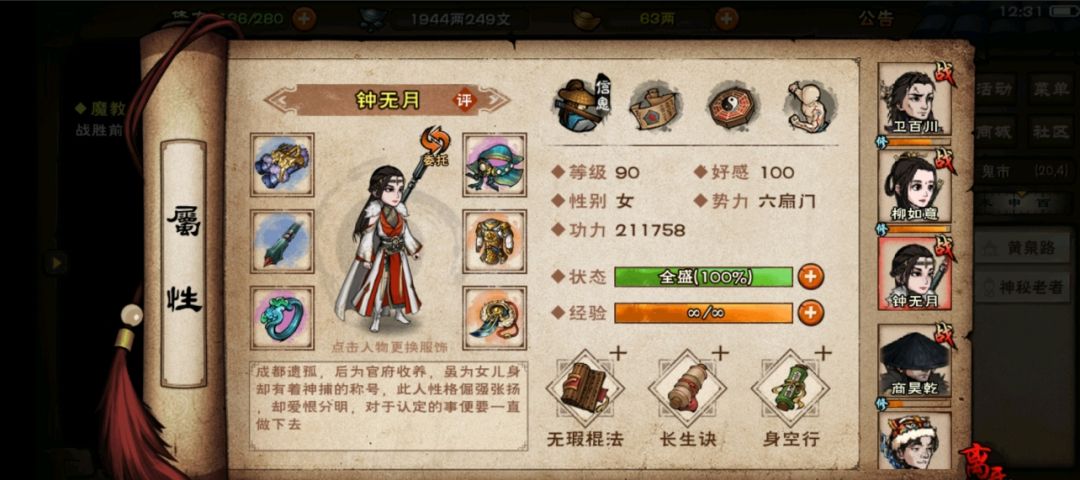 钟无月适合套路:经过测试,钟无月的大头放在后排增加聚气次数优于前排挡刀。武学获取办法:第一,拜师三阶第一段师傅,学习上乘套路并突破到六重。找三阶师傅点击传授武学再选择狂狮刀劲或者啸风刀劲。重刀要求去(32.22)(28.1)(45.18)采集阴阳花(只需1朵)。找到并服下后进入恐惧幻境,恐惧幻境的路口尽头会有骨头。点击骨头会传送到别的路口,直到面对最终BOSS。 第二,路过南阳度画摊,画师会叫住
