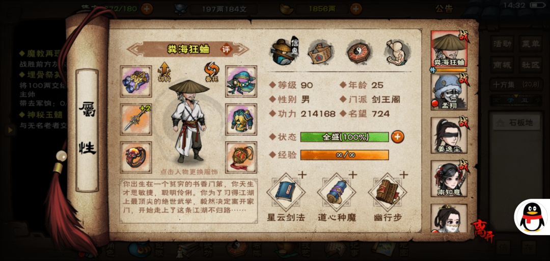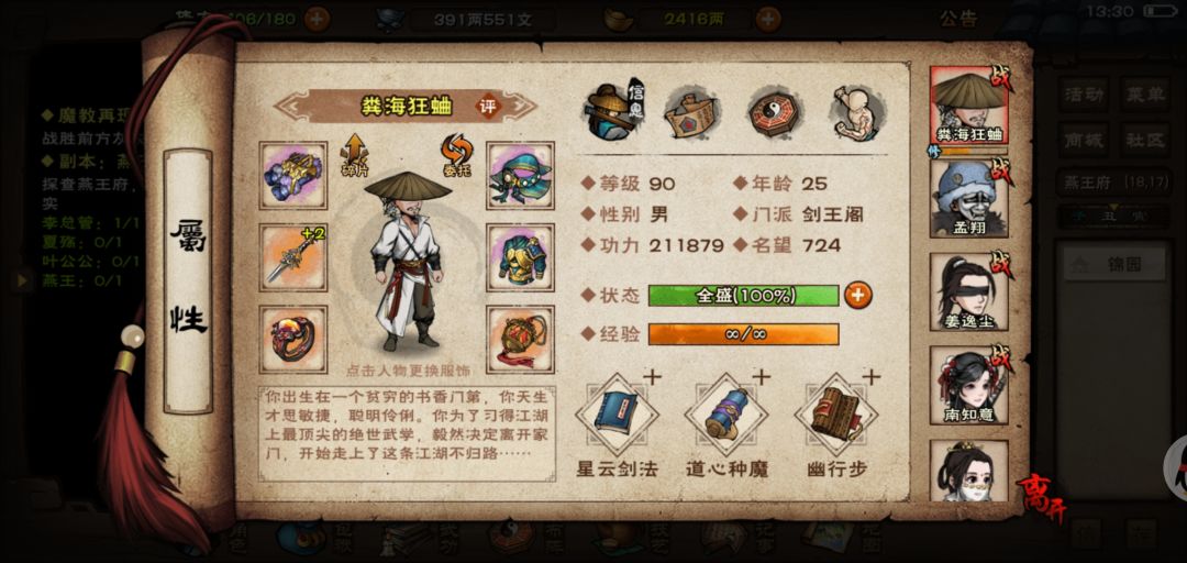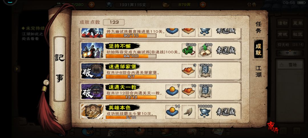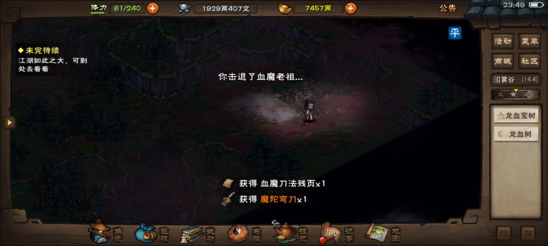 开局天赋选择跋山涉水(武林世家,自由成长最后选择,江湖秘宝),注意此时的天赋为跋山涉水,身法为12点(如果身法不是12最后会玩道小会出现443身法,99.9%三连) 随从选择 有基金或者500档,僧,薛,商(万金油),萧(小星云) 零氪或月卡陶,柳,姜 月卡基金开局可以先买一个僧,等后续基金够了买薛,最后决定买商或萧 参考烟雨江湖wiki过主线一直到张雄,击败张雄之后记得摸尸体(5次)之后去勾玉夫