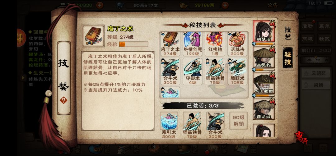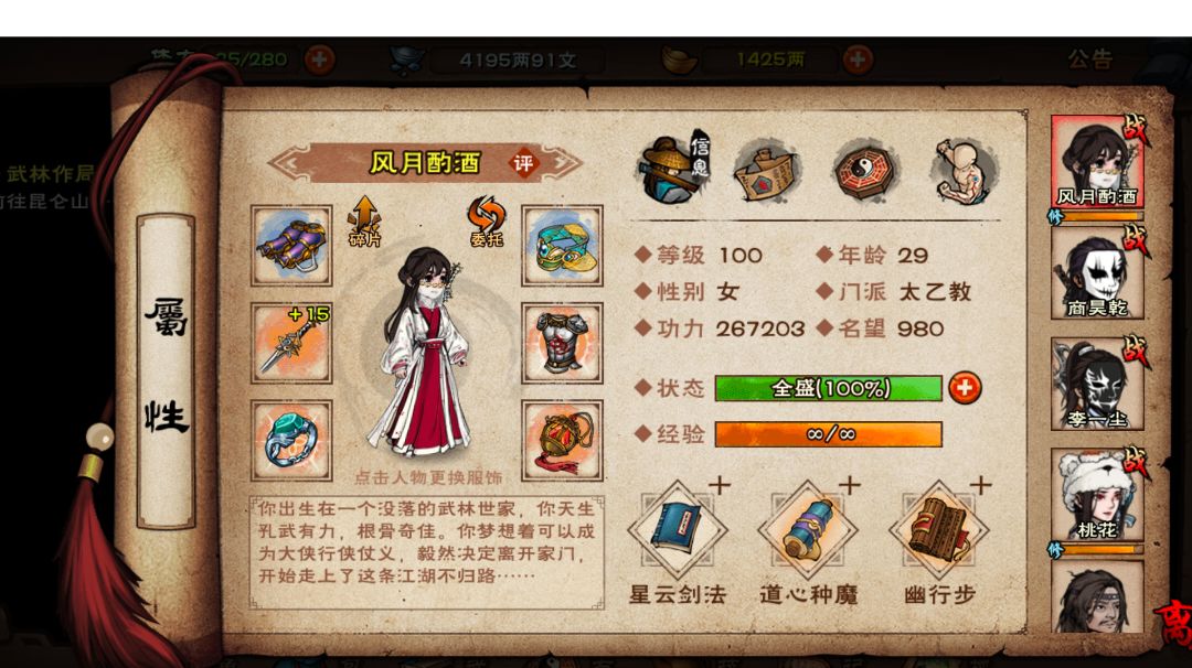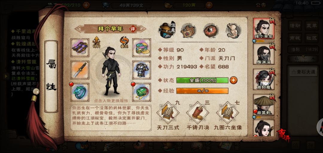 开局天赋选择跋山涉水(武林世家,自由成长最后选择,江湖秘宝),注意此时的天赋为跋山涉水,身法为12点(如果身法不是12最后会玩道小会出现443身法,99.9%三连) 随从选择 有基金或者500档,僧,薛,商(万金油),萧(小星云) 零氪或月卡陶,柳,姜 月卡基金开局可以先买一个僧,等后续基金够了买薛,最后决定买商或萧 参考烟雨江湖wiki过主线一直到张雄,击败张雄之后记得摸尸体(5次)之