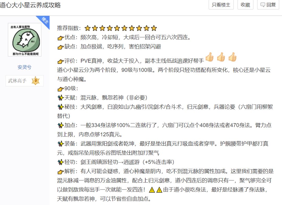 本文旨在介绍如何更快获取道小首先介绍一下,什么是道小? 道小,顾名思义,主要由小星云(星云剑法,进阶)与极乐谷镇派内功道心种魔,以及轻功逍遥游/踏月/天外天/幽行步(百级精进后)的搭配。 ⭐优点:调息快,出伤率高,一人即可挑起全队输出大梁。副本速刷,PVE战斗方面表现优秀。 ⭐缺点:吃序列,受招架闪避影响大,加点极端。 ⭐道小判门路线:1.开局加入天刀,走重刀路线。40级拿活脉术,