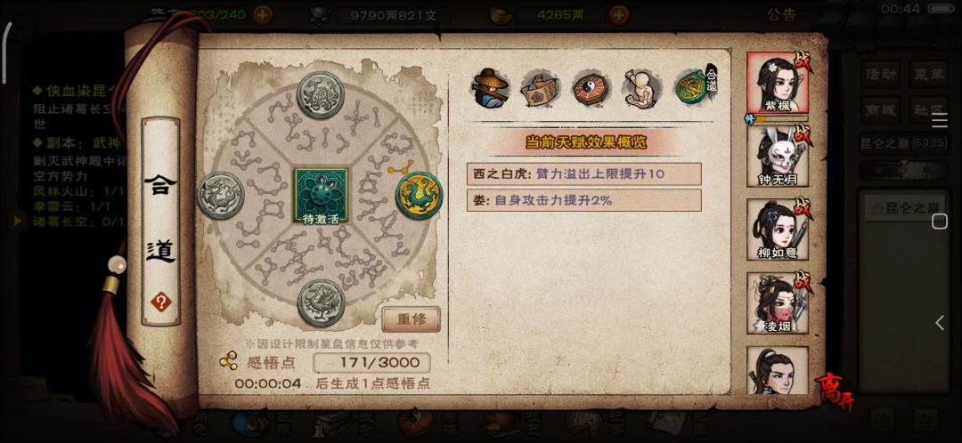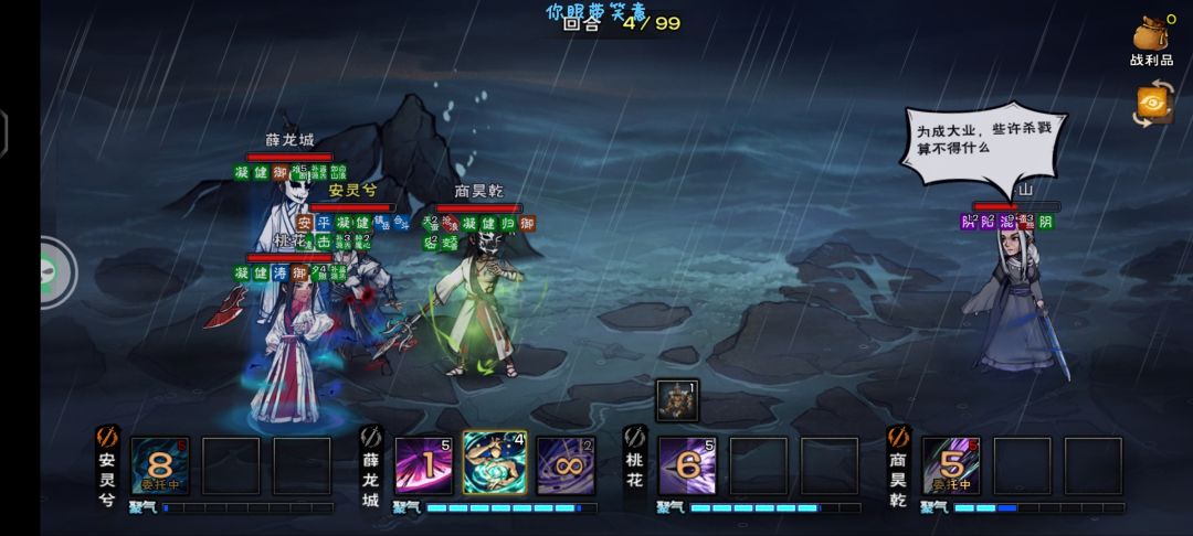 人物核心: 主角混元道小、奶妈柳长生、天蚕僧、工具人(越多越好,我有7个); 打法概括: 主要输出是道小,一调息一个,利用工具人托回合,给道小输出机会,简称“回合换伤害”; 人物站位: 梅花阵,上路后位站主,中路前位站僧,下路两个站输出和柳奶妈,这个站位只有僧一个人受到伤害; 携带秘技: 僧带肉秘技和傀儡(1w防御,常驻30免伤,2.5w血量),主角道小秘技套装(谈攻击琴攻击达到5K),柳当然带奶