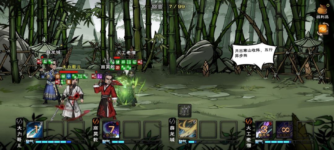 今天得磕药才能打过,琢磨了下机制。 大概就是5个人其中一个是阵眼,另外四个分摊伤害。一段时间不换阵,阵眼会开强化大招,比如泠月舞觞四连飘,少林关灯,龙枪变招。因为阵眼不分摊伤害,相对来说最脆,有些阵眼在后排,用群体或者切后武学打会好点,高协战武学或者连击武学也不错,可以减少狼枪武备。