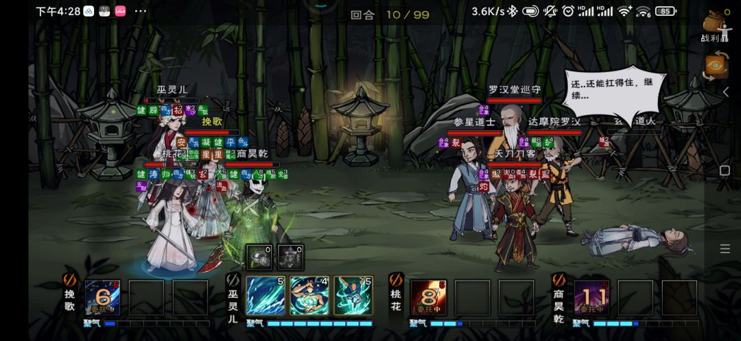30%昨天吃饭的时候5分钟挂机过,今天40%从八点搞到十点,花了两个小时才打过,硬生生把每一个序列给记住了 开局第3个普攻之后,放小星云不会被打断,秃驴换阵之后,让他平a一下之后再放星云不会被断,傀儡丢到阵法中间能活三个回合,让对面的冷月三连击两次全打到薛的身上用步天硬抗 这还小星云只被招架过一次的结果,不然感觉今天晚上都sl不过去,希望明天没有这么超模的序列