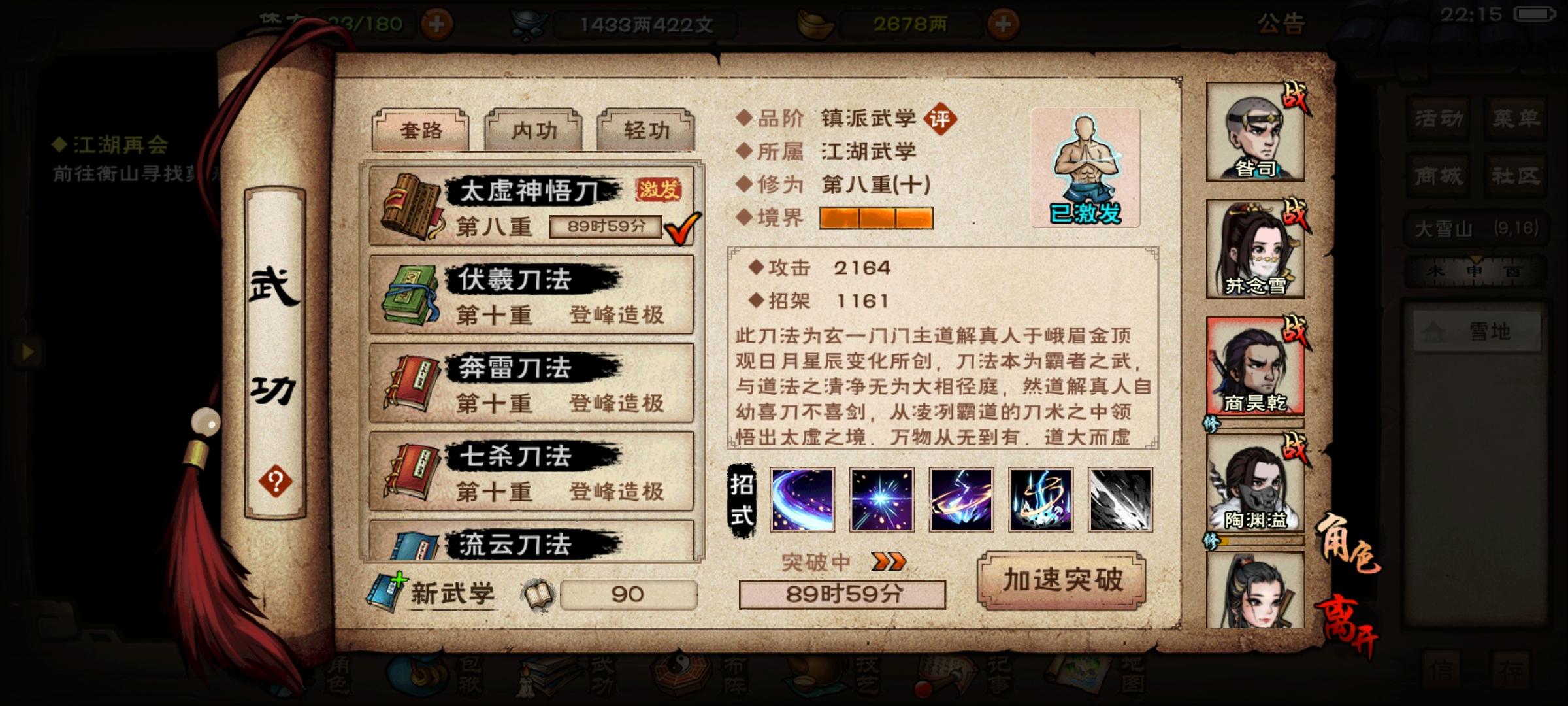 前言:碧波神功和碎星步,凌波微步和太玄神功一般不考虑。一般篇主角武学一直用门派的(进阶内功用浑天气功),轻功早点学到雁行功9重(优先)和水上漂9重一般刀法建议打洛阳左上角的洛龙村的周石天(6,3)掉落的流云刀法。剑法→孙邪的点墨剑法枪棍→用武馆的齐眉棍法拳脚→武馆的太祖拳法(或更强的铁砂掌,不过铁砂掌无法传功,需要慎重)内功先每人(判门主角除外)一本气引术(3重满)和吐纳功(3重满)