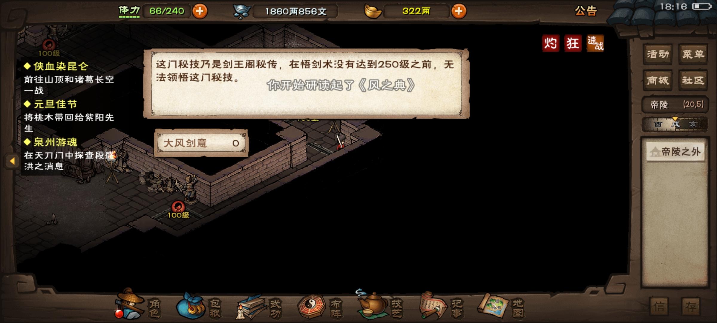前几天拿了大风判门回太乙合道去了,结果今天想学大风,告诉我需要250悟剑术,我这时才想起来我悟剑术才240😭