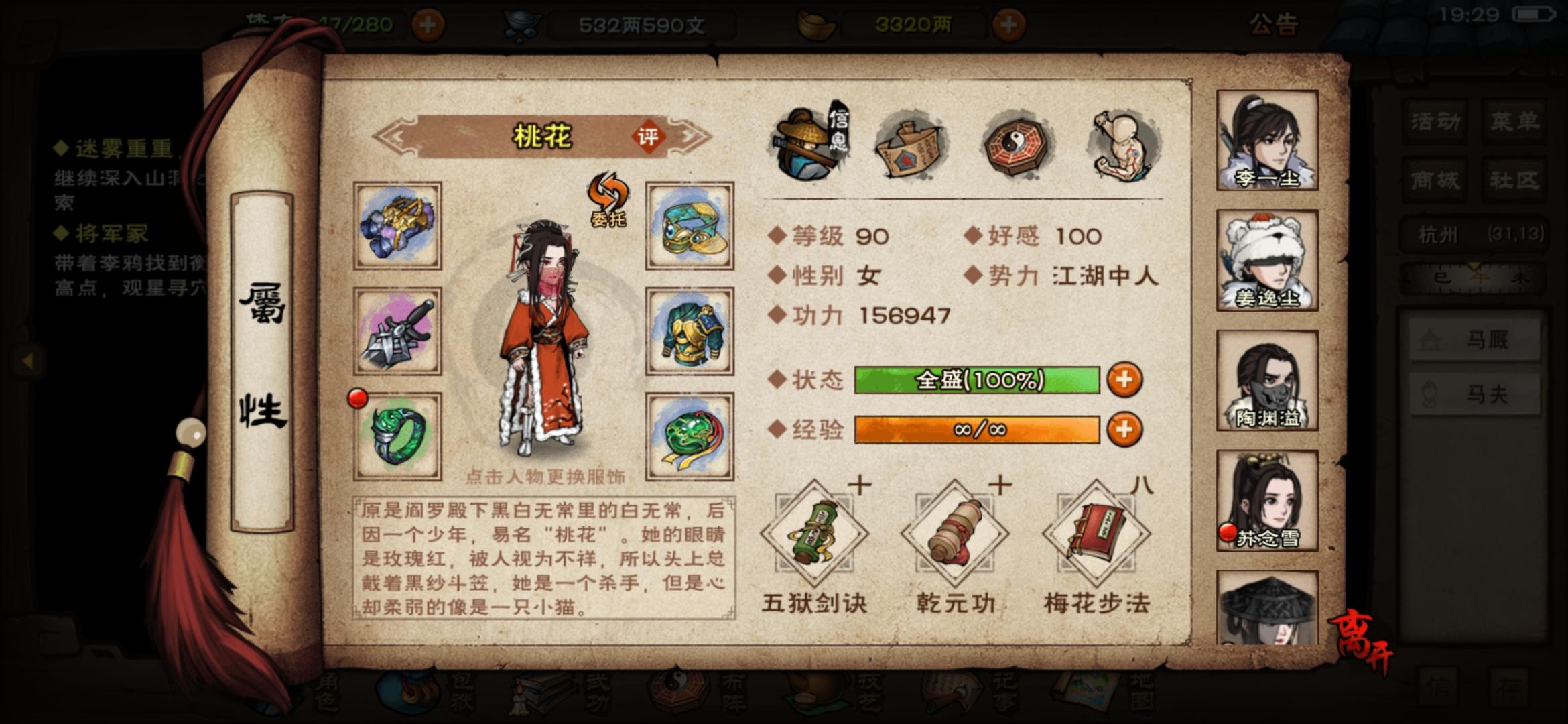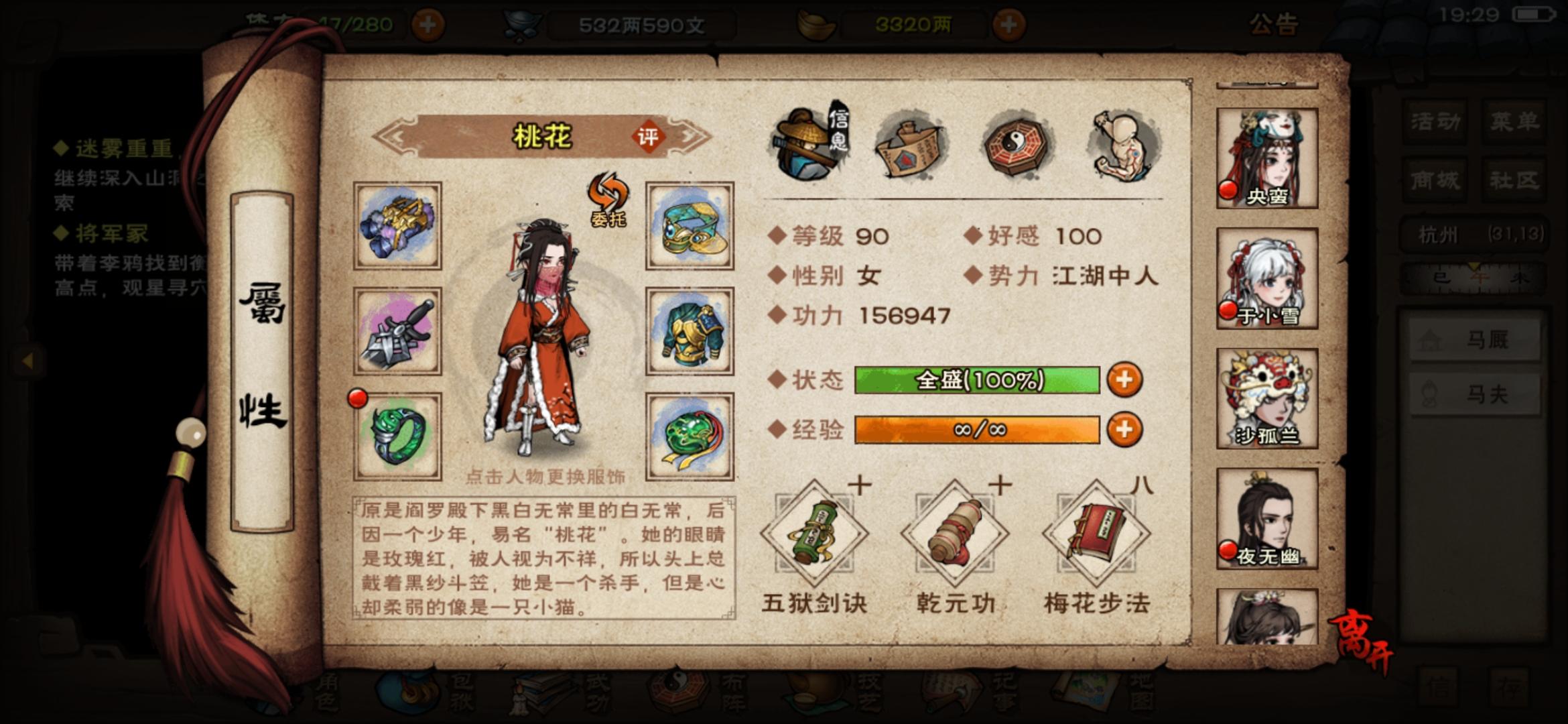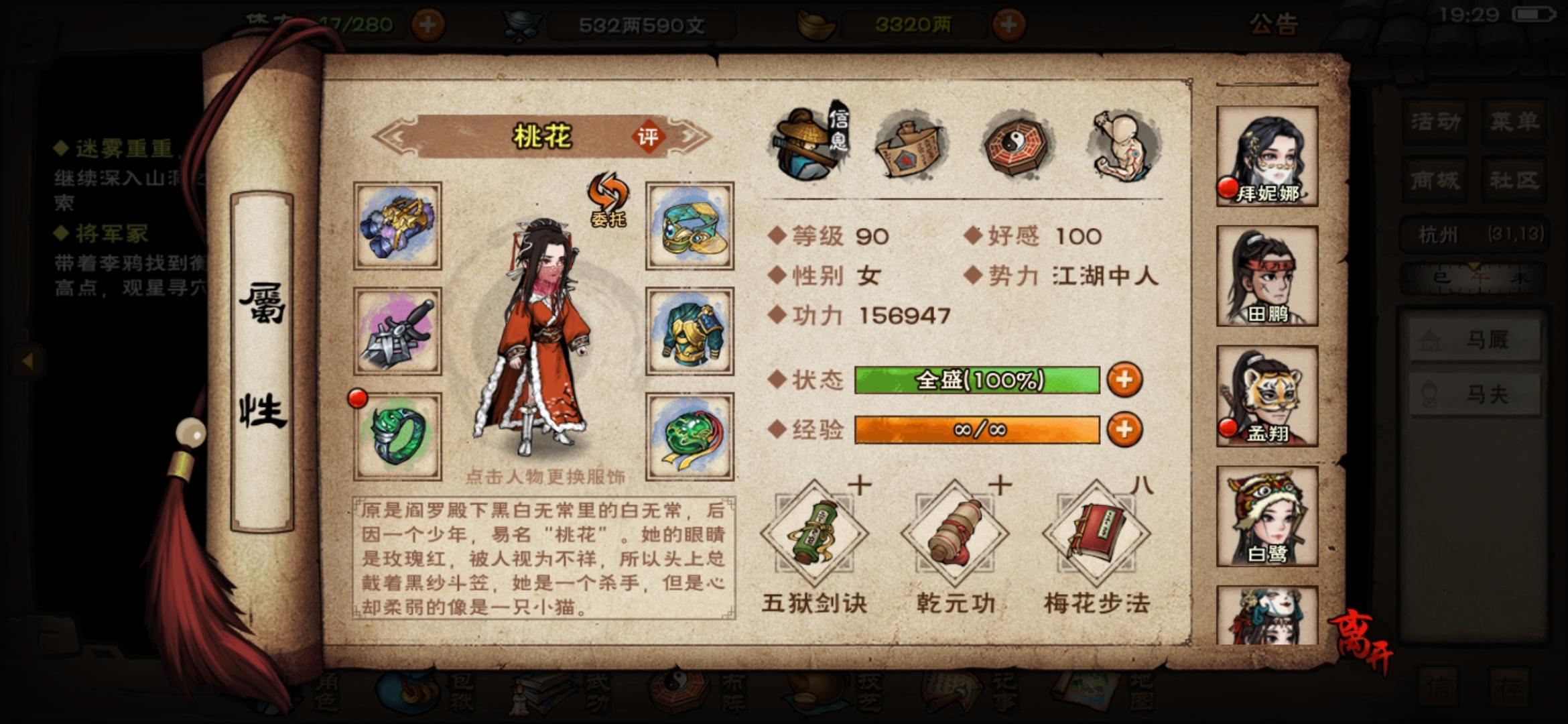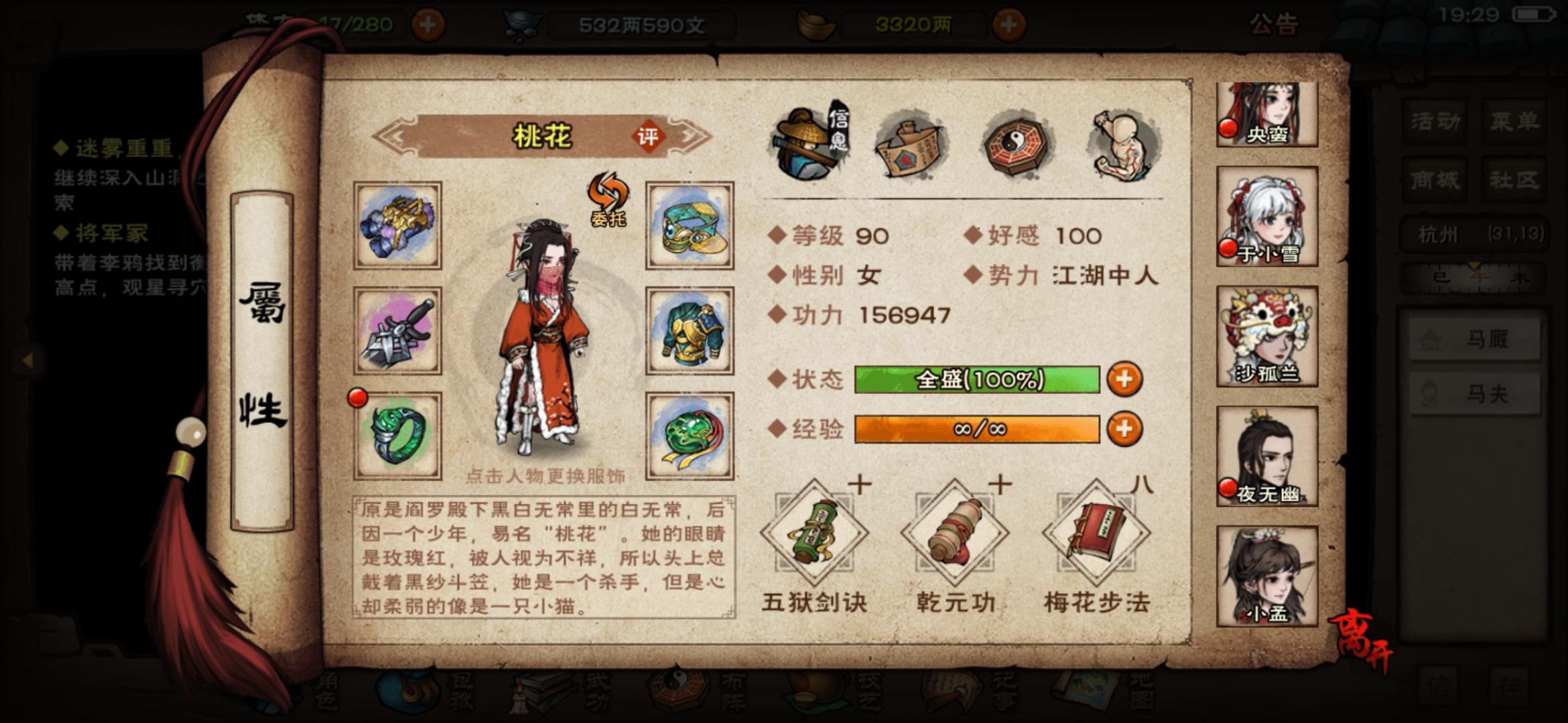 每一个比较强势的角色都有 缺了月和薛这两个比较好一点的 其他的就没怎么买 现在鬼市也毕业了 碎星和碧波都拿到了 现在小势力就八卦门和巨鲸帮过了 其余紫阳书院10000 归云岛拿到蛟龙刀了 现在七十四万战斗力 燕王主线还没推到(其实不知道推没推到)枯骨门可以过了 正在弄两个镇派 也再弄长生 乾元也拿了 血魔经也拿了 在弄天武罡气 感觉现在也都挺顺的 但就是迷迷茫茫感觉不知道要干啥 属于没出新手村就迷