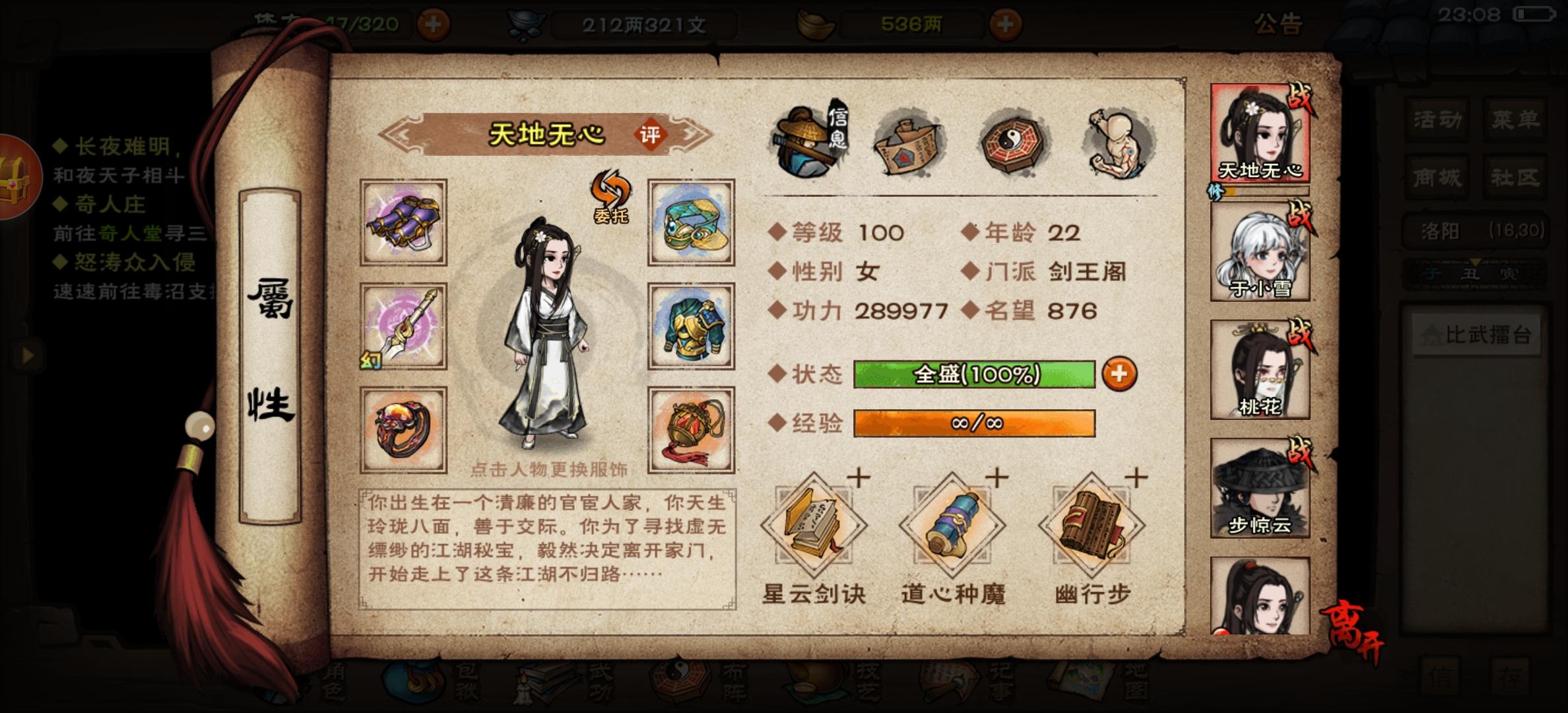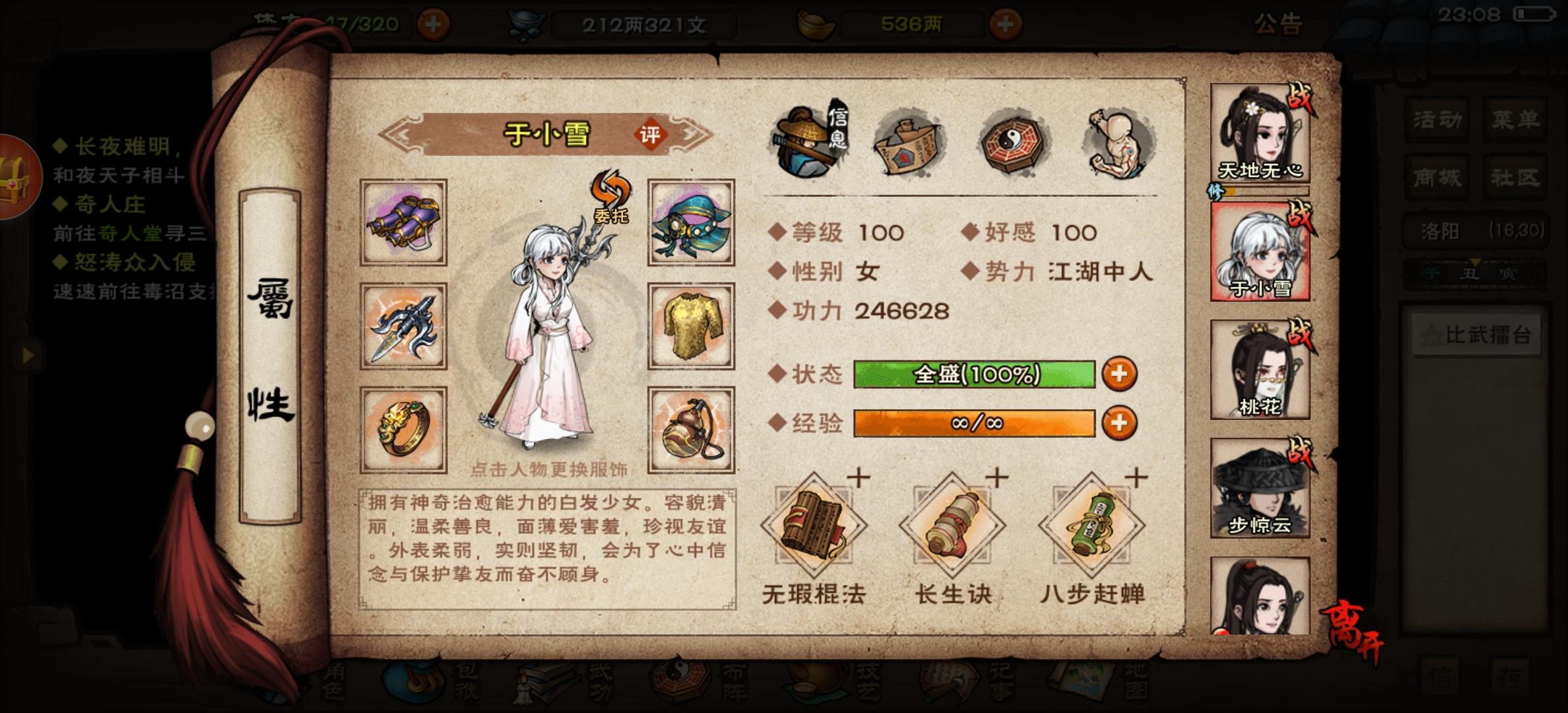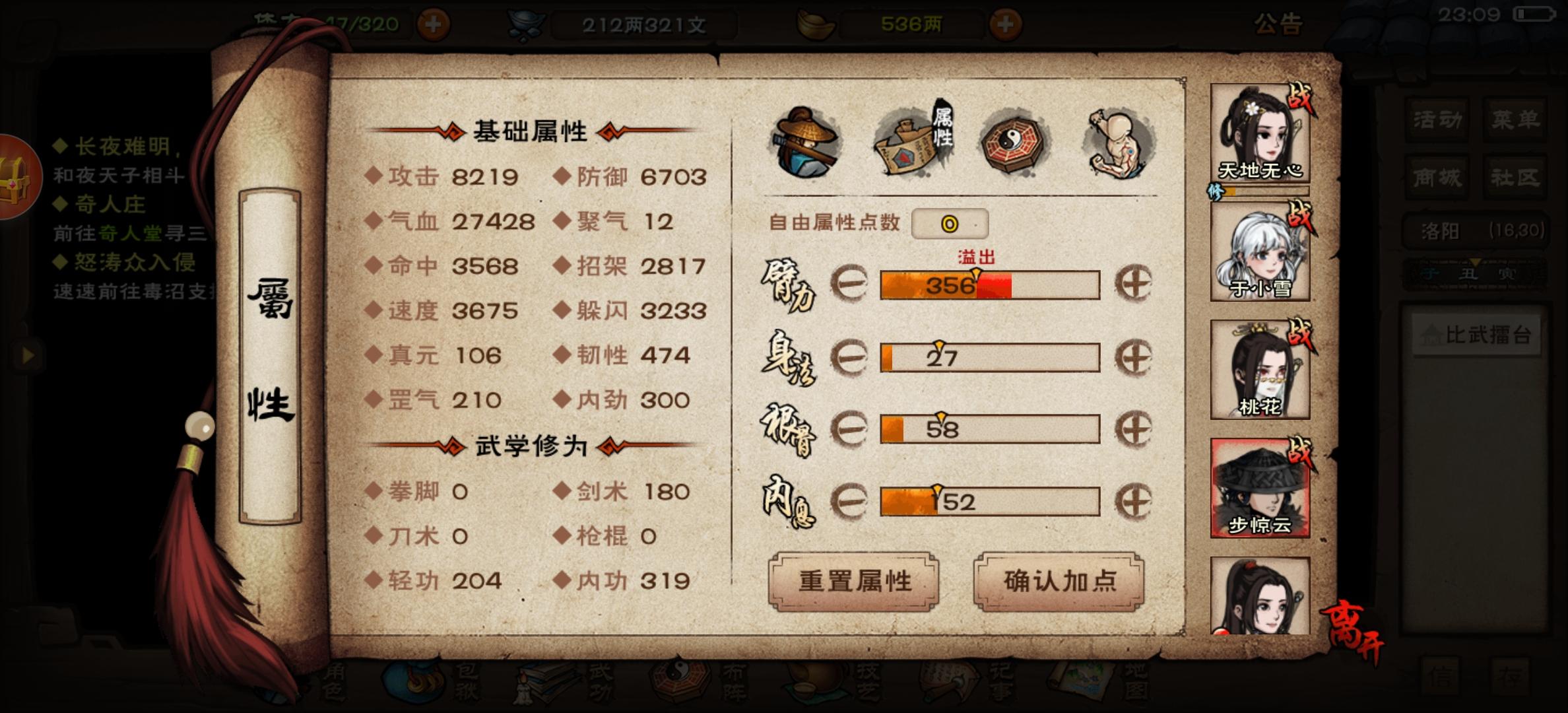 井盖。 舞殇4重,辉月7重,踏月5重, 太阴9重,道心10重, 神丐。 烈阳10重,离火10重,梅花8重 长生3重 商少爷。 太虚10重,乾元9重,梅花10重 僧。 无暇十重,龙象10重,踏浪行10重 青娥7重。 进度:燕王的手下败将!