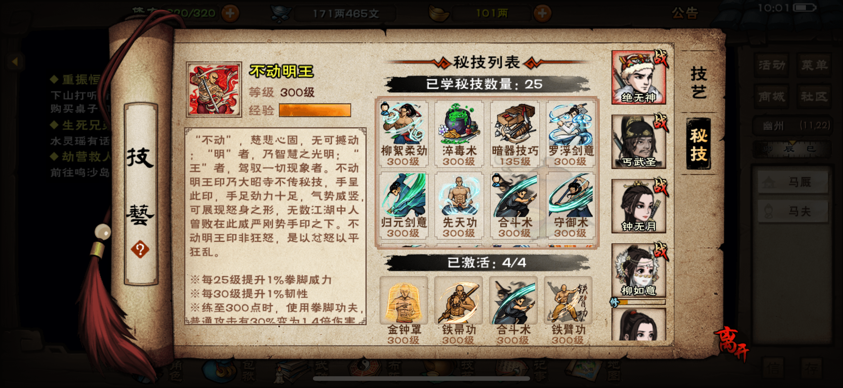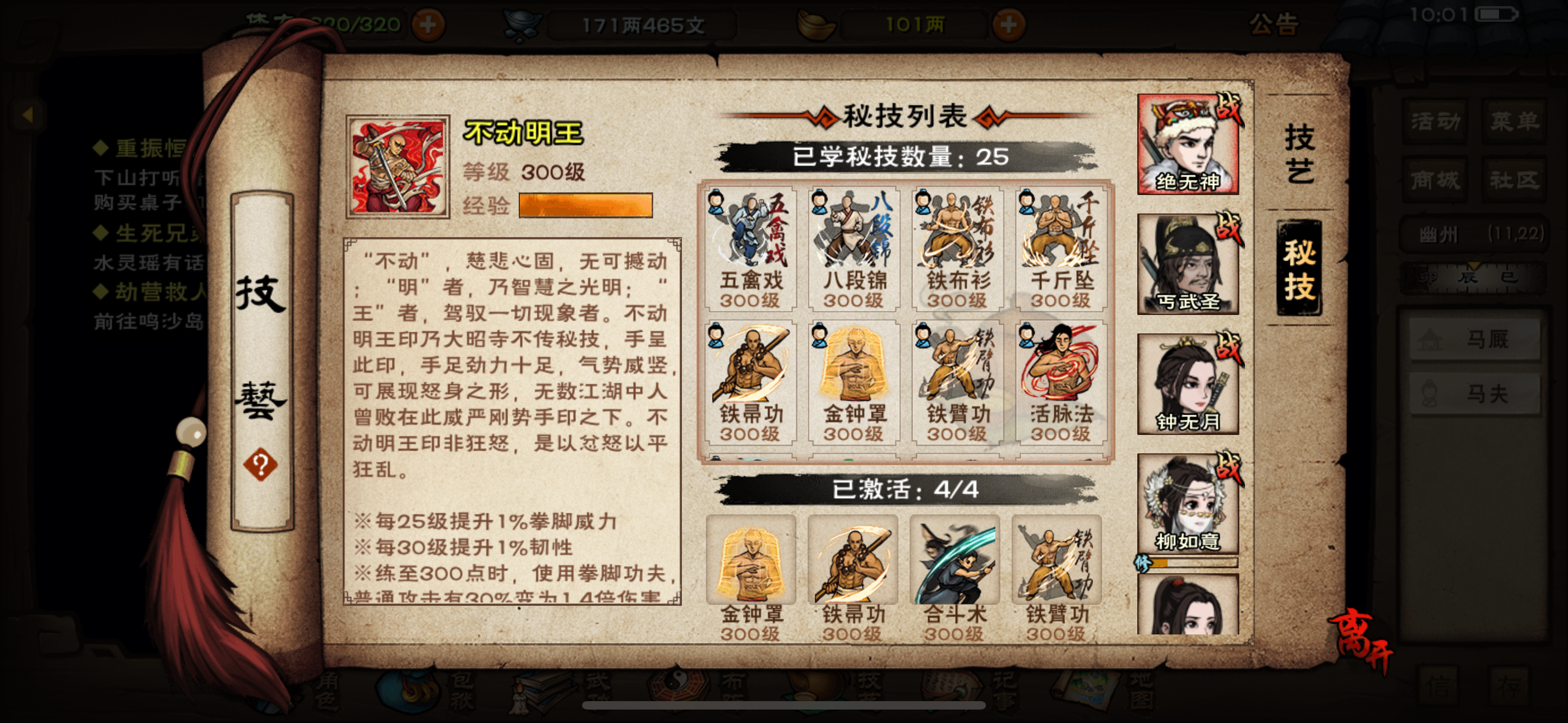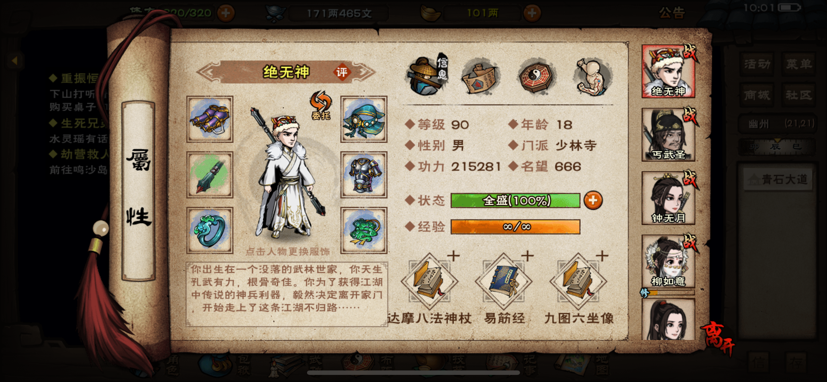 主力角色孟太虚刀,央蛮无暇棍,步剑,还有于小雪刀(用的不多,和央蛮换着用的),主角是太阴拳 求大佬指点武功怎么搭配,现在在打厂狱,之前的武功该有的都有了 孟太虚,龙象,身空行,20万战力 央无暇,乾元青蛾天一,天元,20万战力 步云十剑,血魔经,月下飞天(没有镇派给他了,不知道给他学什么),19万战力 小雪破锋八斩,长生诀,幽行步,裸装15万战力 现在多了万象,琉璃体,五毒,玄阴,不知
