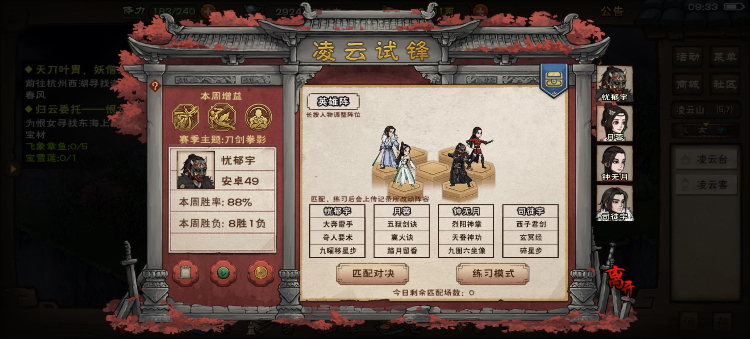 各各各各各位大佬们好好久没汇报和求教了最近一直打墨门(免费一次加刷新一次)为了全图放满采集傀儡也是拼了,目测提升不大血衣楼控制手动技能的话可以稳过老二,不过老三还是有难度,尝试了让他自己爆炸,但还是扛不住他的技能上乘目前主角用的门派的(泠月是真黑啊)随从柳学了伏羲➕元引钟还在为了泣玉和种玉努力苏的话目前打不过血衣楼老三,有点迷茫目前可买和已有的内功百
