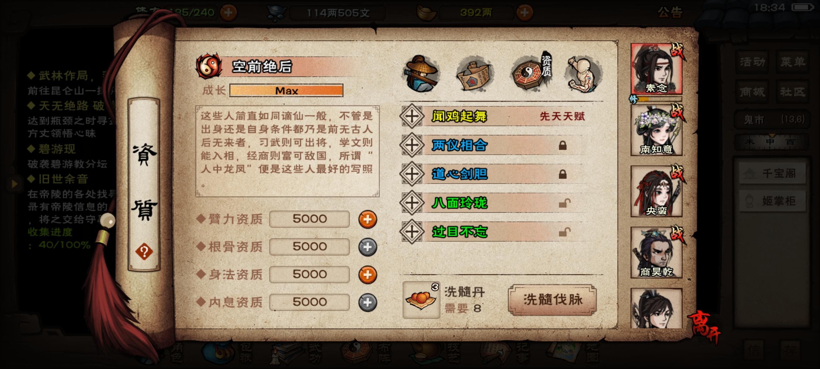 前言:碧波神功和碎星步,凌波微步和太玄神功一般不考虑。一般篇主角武学一直用门派的(进阶内功用浑天气功),轻功早点学到雁行功9重(优先)和水上漂9重一般刀法建议打洛阳左上角的洛龙村的周石天(6,3)掉落的流云刀法。剑法→孙邪的点墨剑法枪棍→用武馆的齐眉棍法拳脚→武馆的太祖拳法(或更强的铁砂掌,不过铁砂掌无法传功,需要慎重)内功先每人(判门主角除外)一本气引术(3重满)和吐纳功(3重满)
