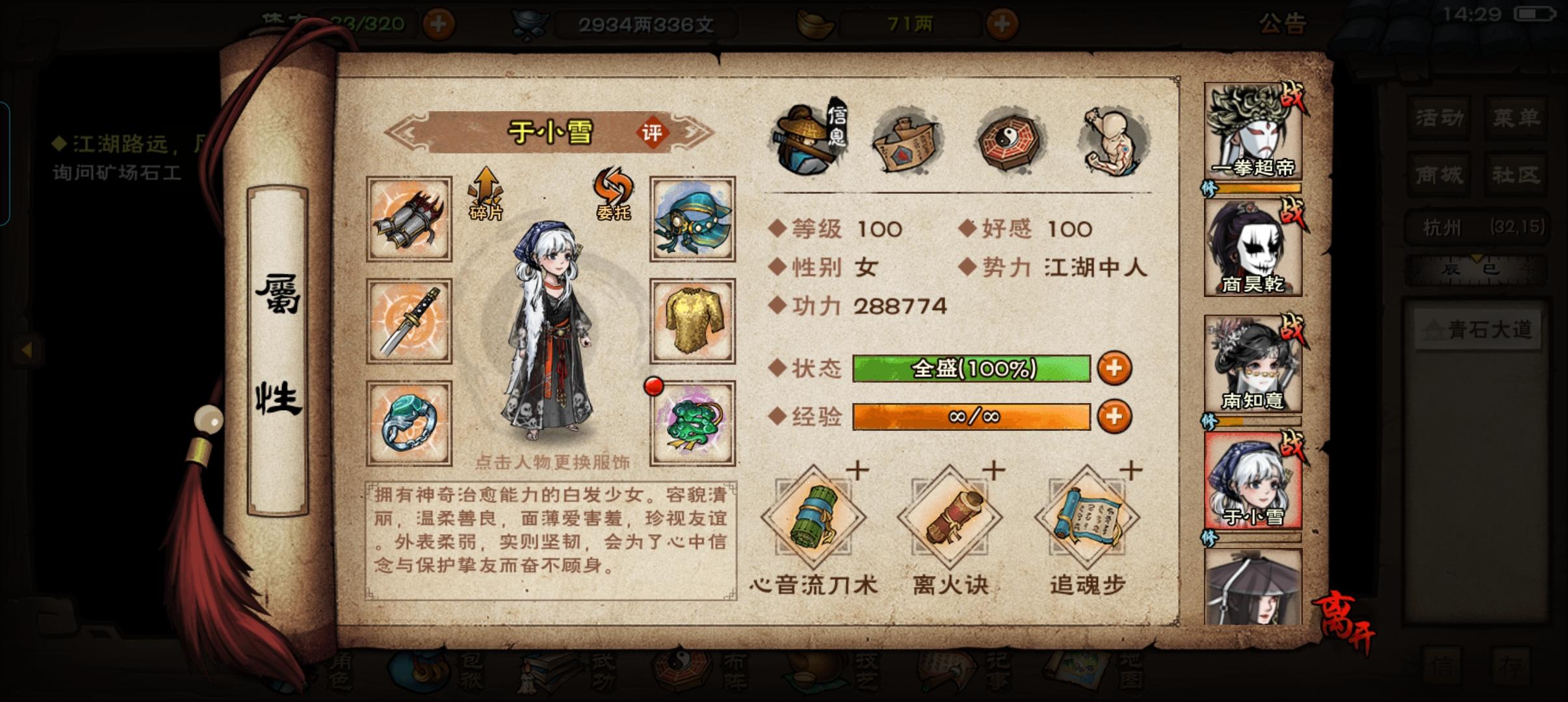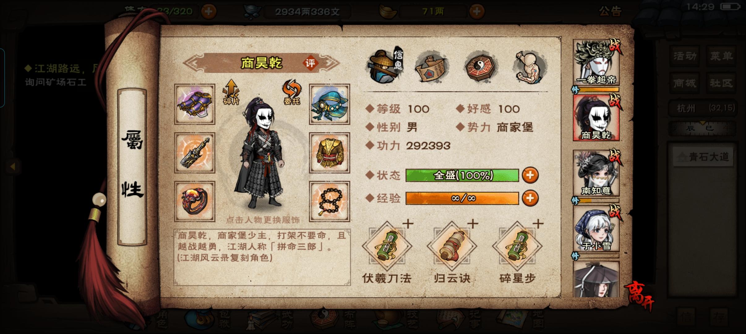 买了个单机版,花了十天时间大概50多个小时通关了一下剧情,只是一路推了主线,没有玩支线,除了救药王那个支线,因为药王不救的话后续主线就请不了樊宇,要是玩支线的话,这游戏的时长还能翻好几倍。 这游戏如果是个买断制单机的话,应该可以仅次于逸剑和大侠,在单机武侠游戏排行榜中列前三。🤔 如果从单机游戏的角度来考虑,缺点也比较明显。 第一点就是剧情是单一线性,主线是一条直线,各种支线对最终结局没有什么