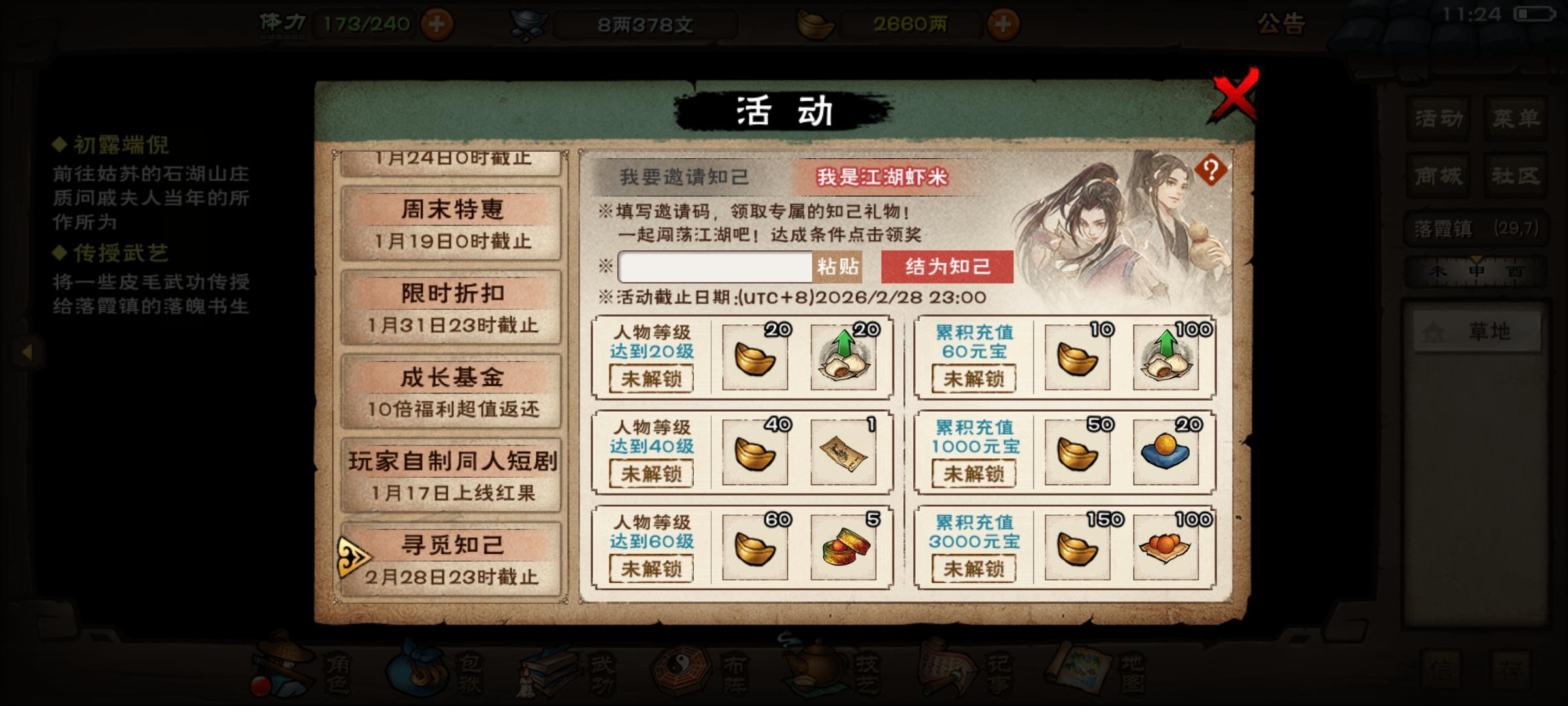 新手福利,右上角点开活动,寻觅知己,然后点开我是小虾米,输入邀请码AAPUEP,可获得400元宝+马车票+8万阅历+120体力+100洗髓丹+20顺脉丹。