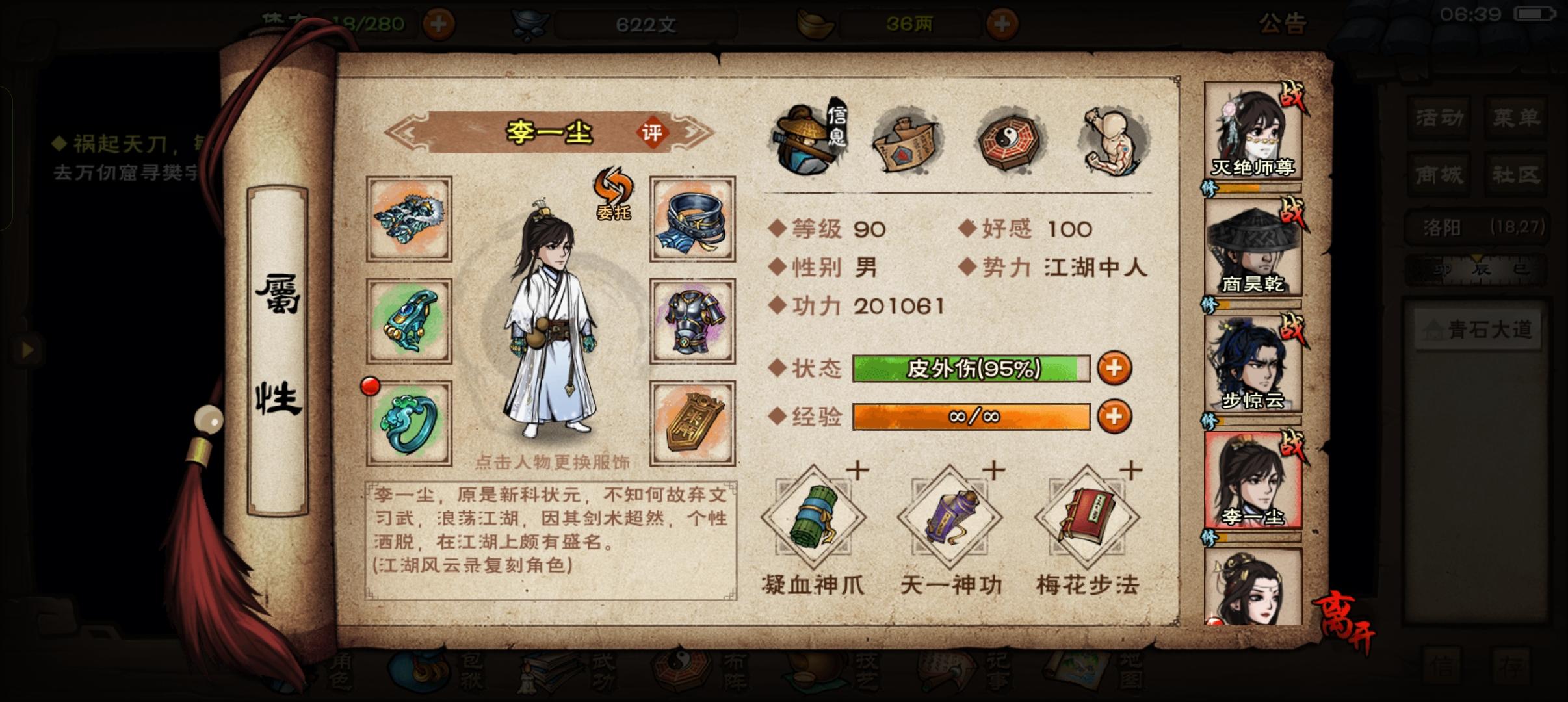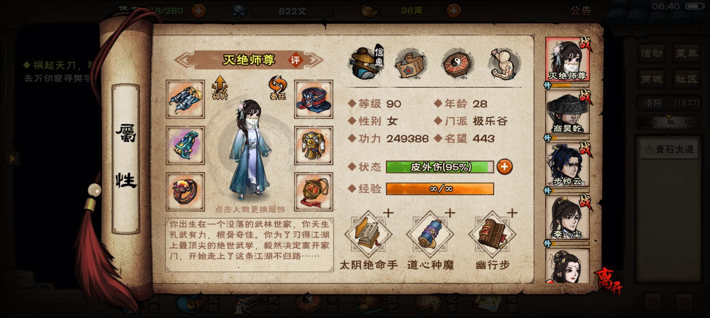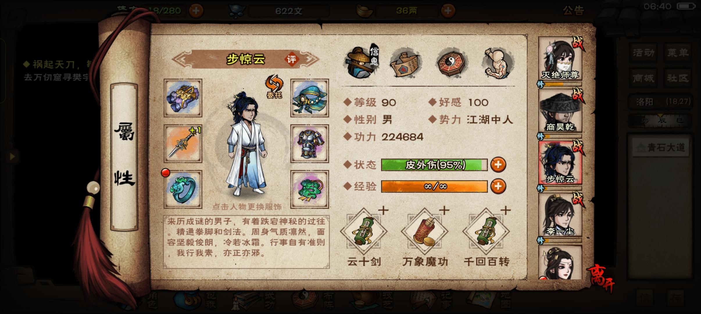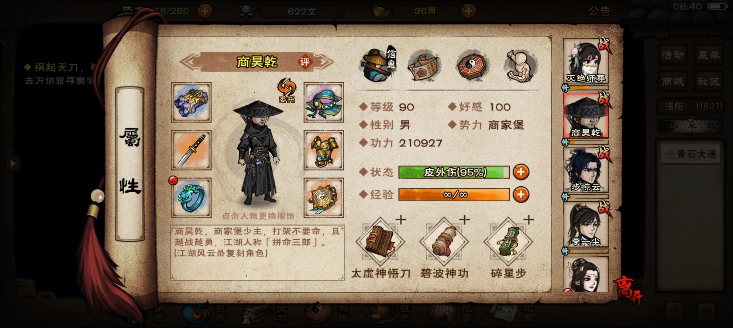 商:太虚归元,乾元9,梅花。僧:无暇10,龙象11【青娥8】,踏浪10丐:烈阳10重,离火10重【长生7重】,梅花主角:太阴9,道心十,踏月5