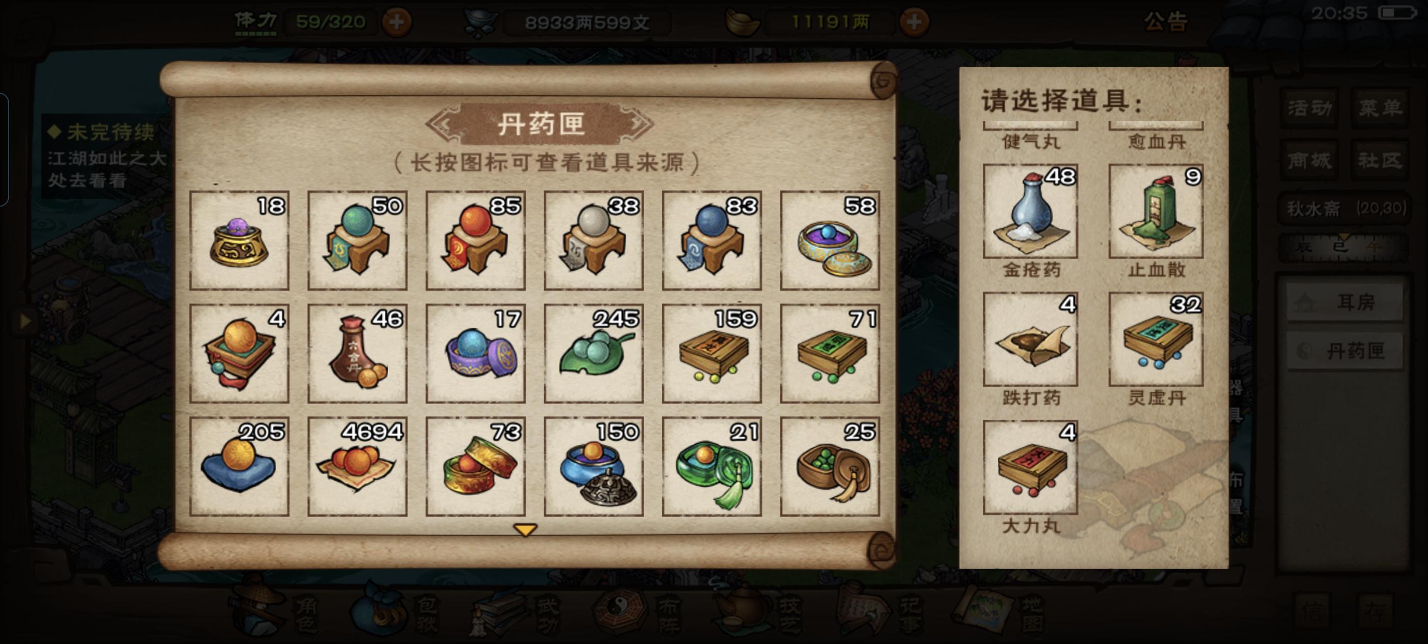 20.21年的时候打过燕王就退游了,22年的大概在极乐谷出来前3个月的时候捡起来又玩了。中间大概退游过1个月。一直持续到现在,应该算老登了吧。修为明年应该都能满了,修为书攒着攒着不想用了,丹药也越攒越多。装备的话,满意的就这三件吧,还有件10免甲的坯子,要400泥,只能等明年了。材料因为序列不行,也攒了这么多。人物已经7个100级了,经脉全通,资质也都开了。主要是原本是李和僧,今年五一换成南蛮了,