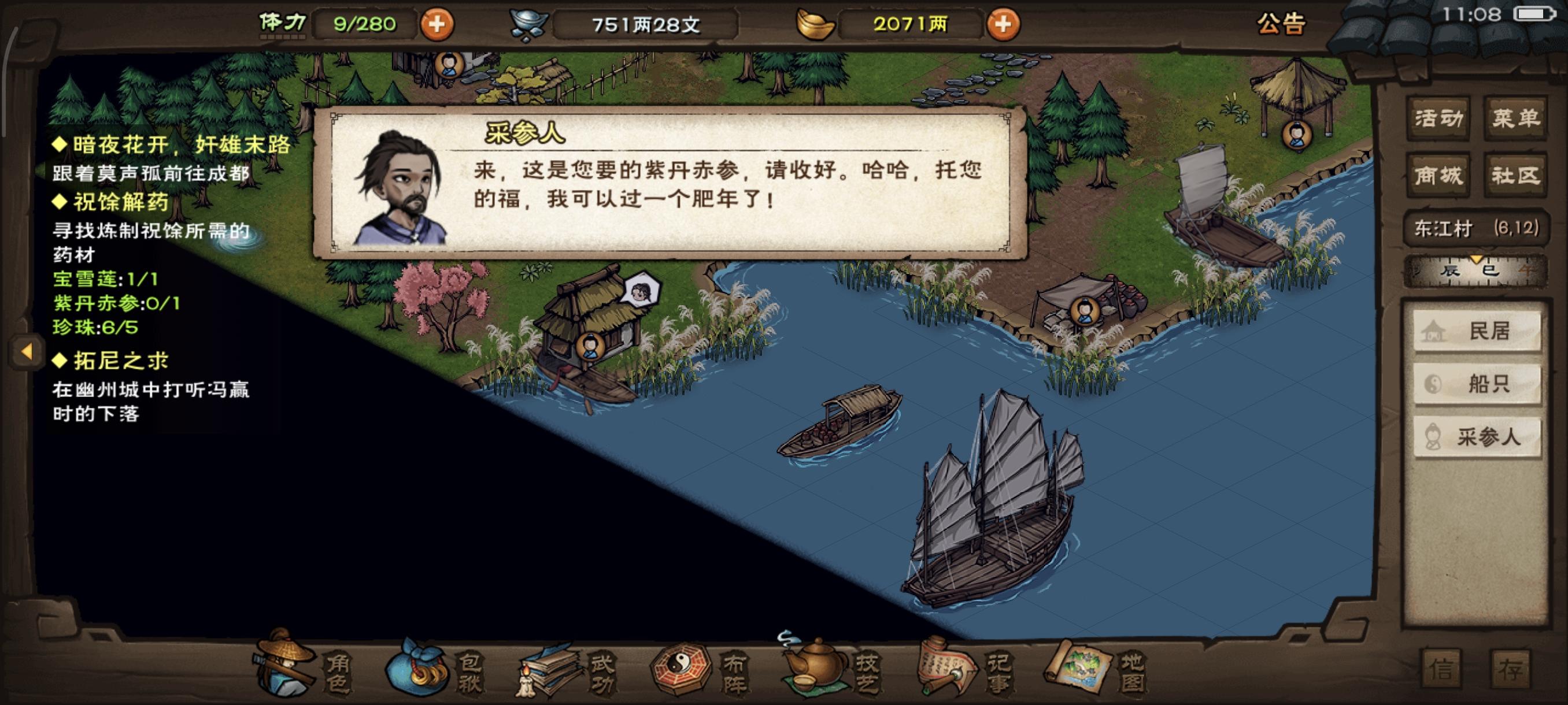 现在已经肘赢了寇马,卡在了葛病。技艺主角:寒引术不动明王白浪如山守御术陶溢渊:朝花夕拾笼斗术闻涛八段锦萧佩吟:红拂袖轻鸿术九幽引柳絮飘劲于小雪:紫阳心经淬毒术(噬心散)千斤坠金刚拳劲