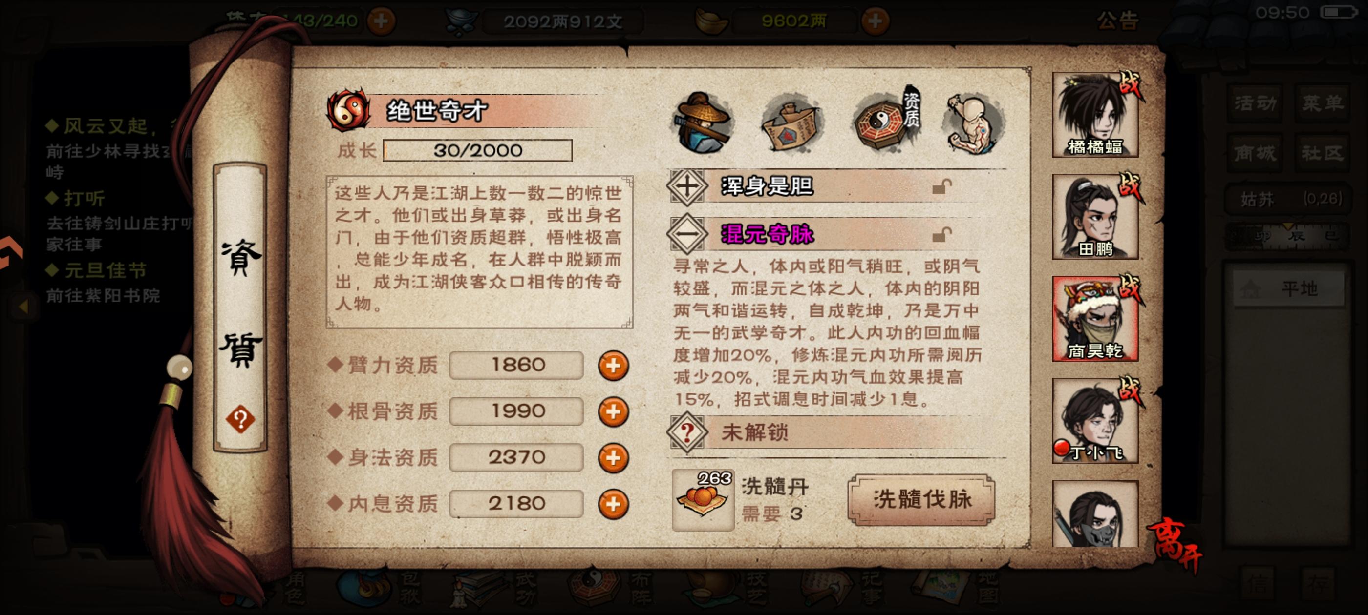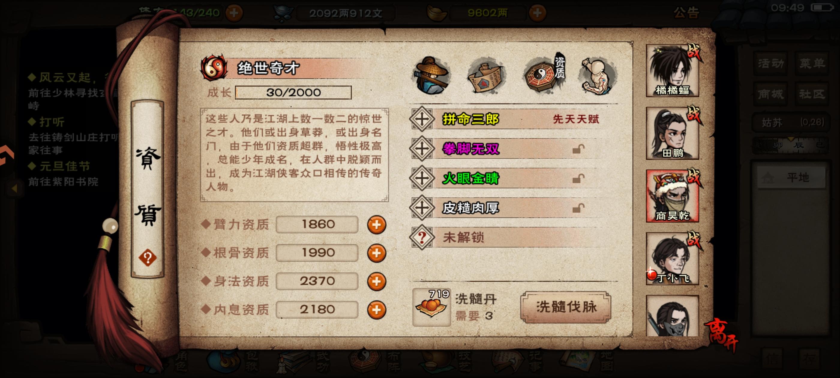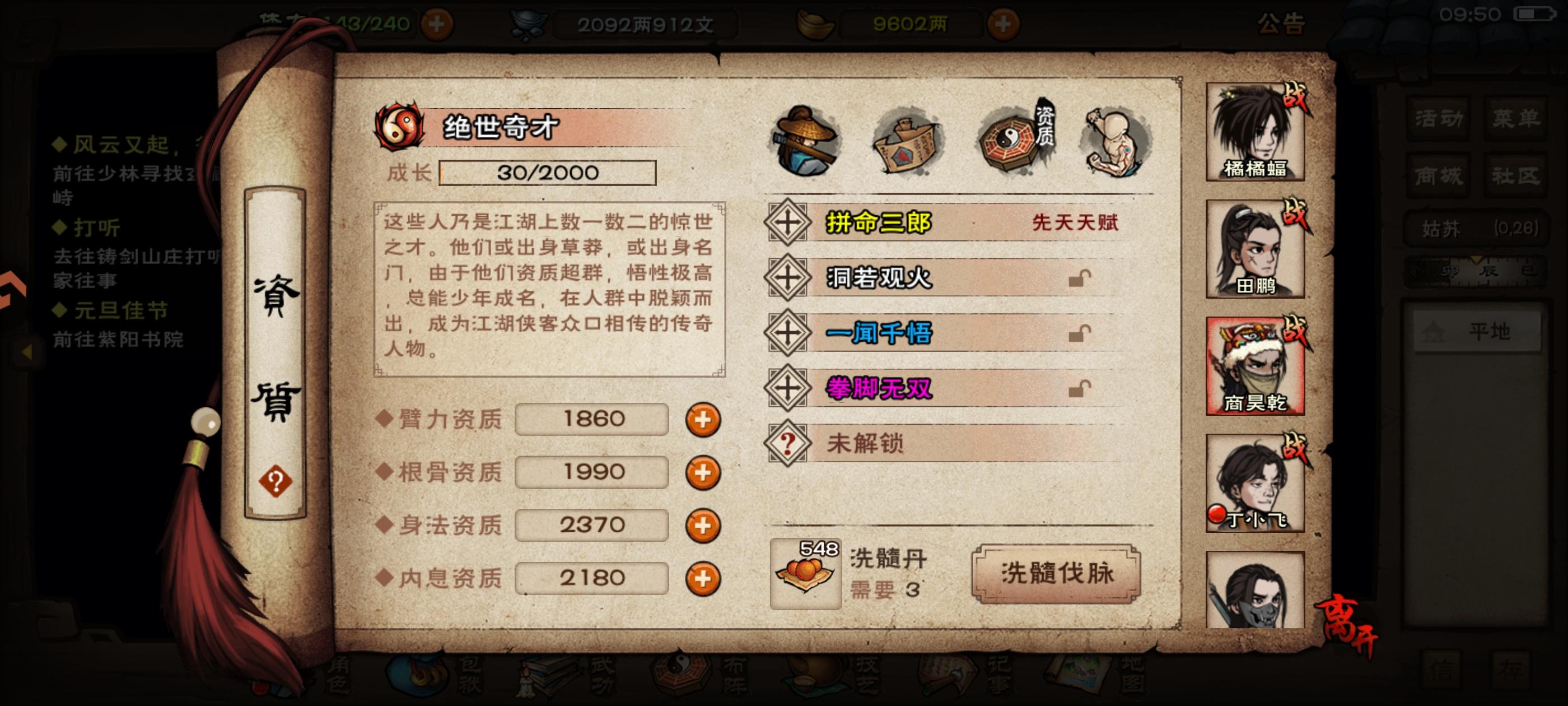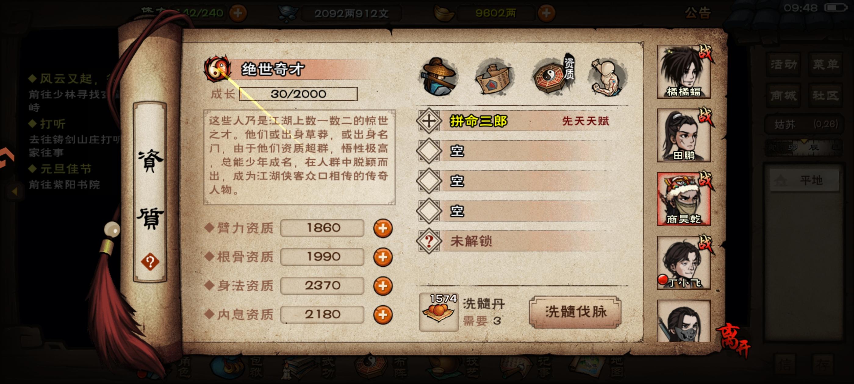 现在已经肘赢了寇马,卡在了葛病。技艺主角:寒引术不动明王白浪如山守御术陶溢渊:朝花夕拾笼斗术闻涛八段锦萧佩吟:红拂袖轻鸿术九幽引柳絮飘劲于小雪:紫阳心经淬毒术(噬心散)千斤坠金刚拳劲