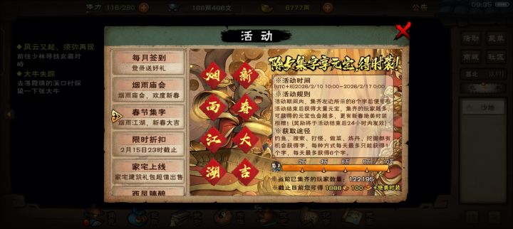 重点:❗❗烟雨钱和元宝一样不能回档❗❗(1)首先,进入『庙会』的入口在洛阳 ,活动大使(2)地图内隐藏烟雨钱:①钓鱼🎣:福安桥上钓鱼,概率出锦鲤和烟雨钱。 ②搜索庙会地图方位 (10.6)(7.8) (15.5) (22.5) 有烟雨钱(3)多余的集字,交给落榜书生,可以得到10烟雨钱+一个祈愿牌(祈愿给100烟雨钱)。(4)算命先生,抽福签给10烟雨钱。(5)烟雨酒楼,领取上一年活动
