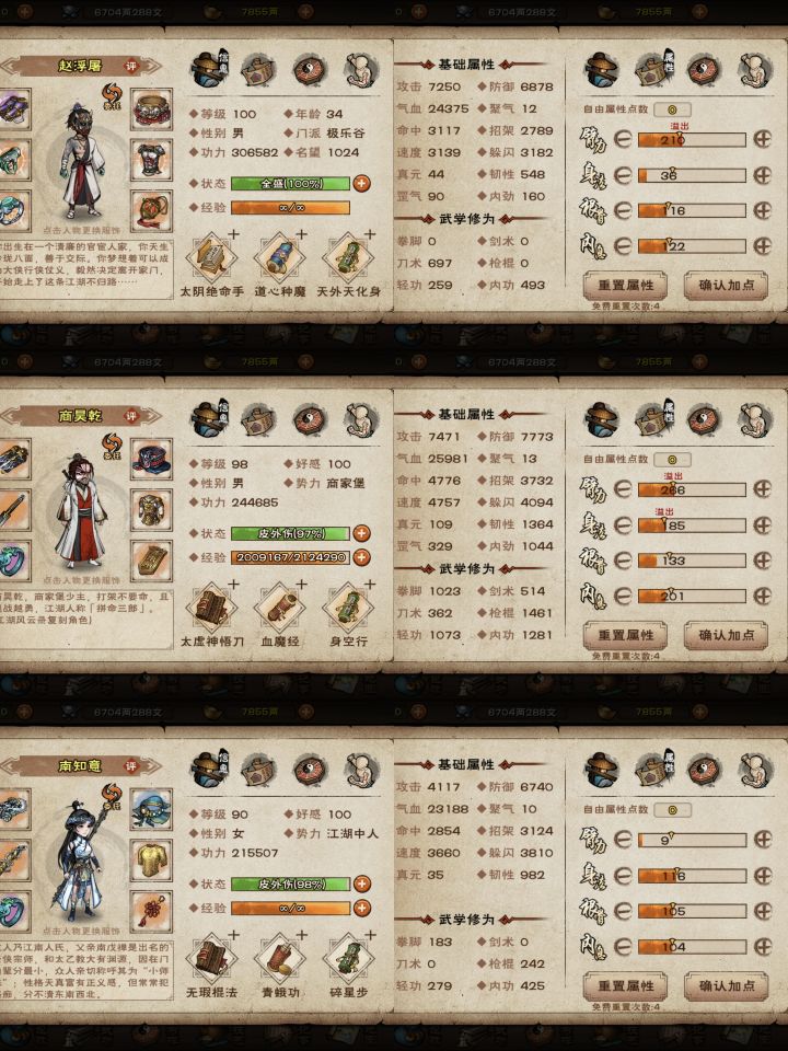 队伍是道小主,无暇陶,剩下的一个,以后应该会买萧佩吟用剑辅助主角。央蛮应该玩剑还是玩刀,玩剑的话,后期会不会镇派剑法不够分了啊,玩刀的话,萧佩吟还对同种武器有增益,有点舍不得这个增益。零氪党,纯pve