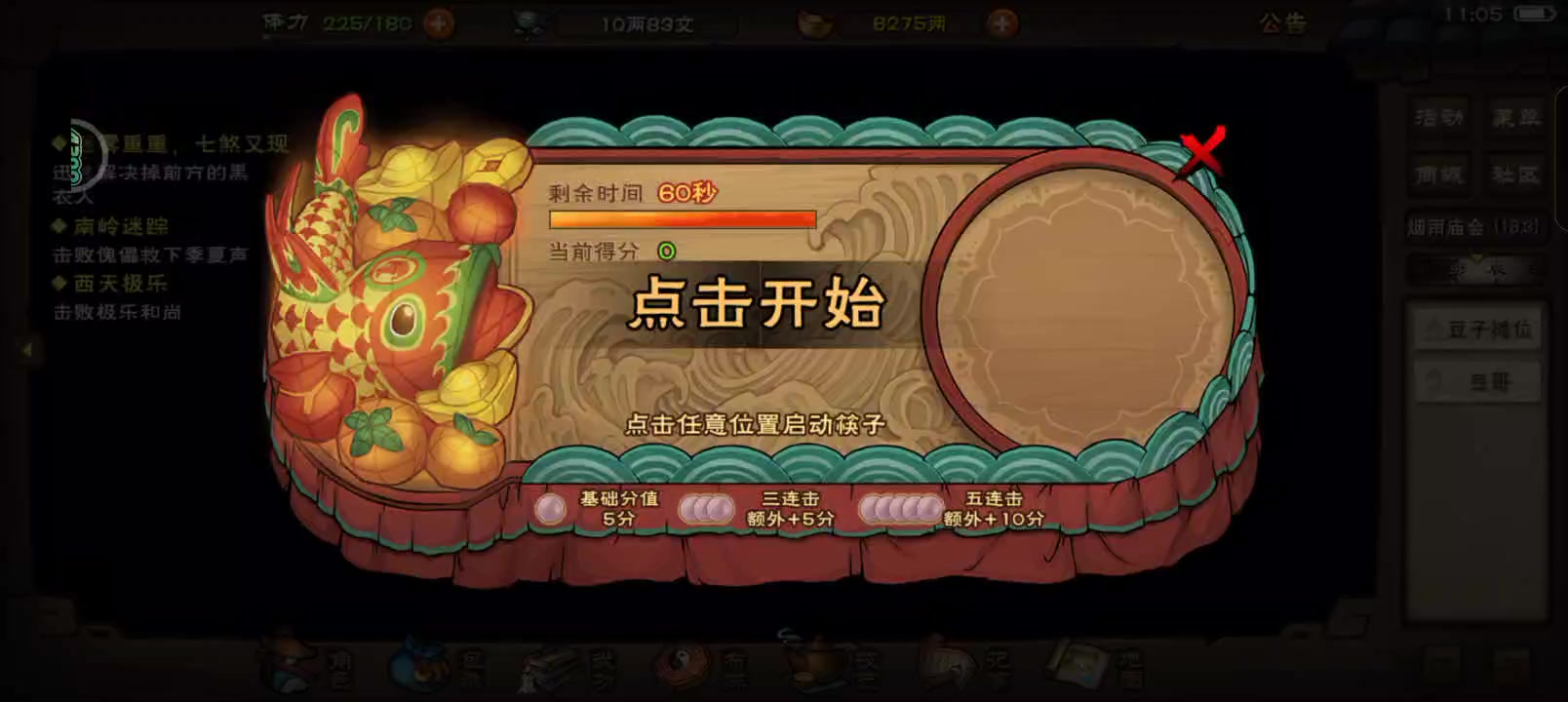 重点:❗❗烟雨钱和元宝一样不能回档❗❗(1)首先,进入『庙会』的入口在洛阳 10.18马车夫处,活动大使有庙会消息(2)地图内隐藏烟雨钱:①钓鱼🎣:福安桥上钓鱼,概率出锦鲤和烟雨钱。 ②搜索庙会地图方位 (10.6)(7.8) (15.5) (22.5) 有烟雨钱(3)进行庙会活动,和伙伴们一起吃年夜饭可获得祈愿牌,进行任务获得体力以及烟雨钱(4)算命先生,抽福签给10烟雨钱。(5)烟