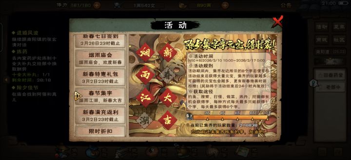 重点:❗❗烟雨钱和元宝一样不能回档❗❗(1)首先,进入『庙会』的入口在洛阳 10.18马车夫处,活动大使有庙会消息(2)地图内隐藏烟雨钱:①钓鱼🎣:福安桥上钓鱼,概率出锦鲤和烟雨钱。 ②搜索庙会地图方位 (10.6)(7.8) (15.5) (22.5) 有烟雨钱(3)进行庙会活动,和伙伴们一起吃年夜饭可获得祈愿牌,进行任务获得体力以及烟雨钱(4)算命先生,抽福签给10烟雨钱。(5)烟