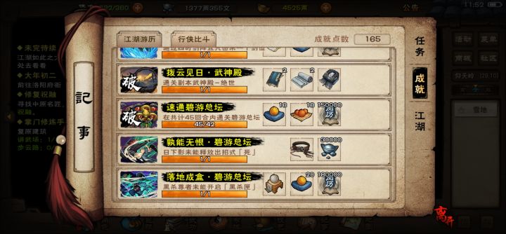 #烟雨江湖 #烟雨江湖攻略 #烟雨江湖周年庆 顺带完成一个老一的成就。谈谈这本里BOOS的强度排行吧,网上都说老一最难打,但我不这么认为,我个人认为:老二双圣使>老一日下影>老三黑杀尊者。①老一日下影,这BOSS没一点机制,纯数值,典型的欺软怕硬,你数值比他高就能把他当宝宝打,我反正是一次就过了,连sl都没sl。②老二双圣使,碧游总坛里最有机制的一个BOSS,目前已知两种打法,单打独斗跟