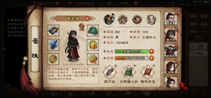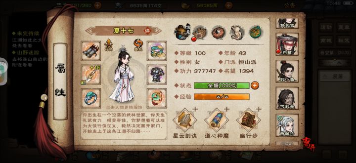 主角81级了,看了wiki才知道八卦门有个天一教,试了试完全打不过。79级的时候脑子一热我判门去了极乐,用的少林4重般若拳+易筋经。叛门后发现极乐的套路是一重重换的。镇派内还要先升上乘内。 目前就啥啥也打不过,每天体力刷刷完就看看有没有什么简单的支线做做。铁刃门我都刷了30次了,太虚刀才11张,起码还要2天才能学。今天刚换到太阴绝命手第四重,每天就是升完套路,然后升上乘道心。 问问各位大佬,