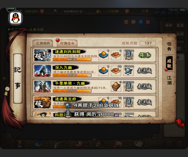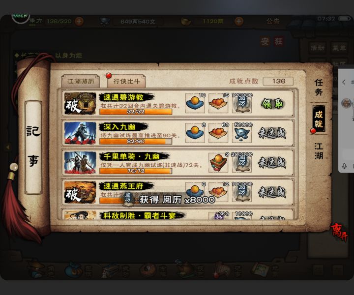我的邀请码AAFPZM,以下是萌新40级前可以做的事 副本及NPC仅显示副本等级,非等级限制;故推荐战力并不具有确定性,等级指的是主角等级;随从可超过主角两级。 10级: 武馆指点 初级 (3回合内获得4000阅历) 加入门派少林寺(仅男),泠月宫(仅女),太乙教,天刀门,苍狼门 学习垂钓,炼丹,道学,佛法,音律,冰心诀,烹饪各种技艺。(请移步技艺与秘技) 非泠月宫弟子可以通过赠送礼物