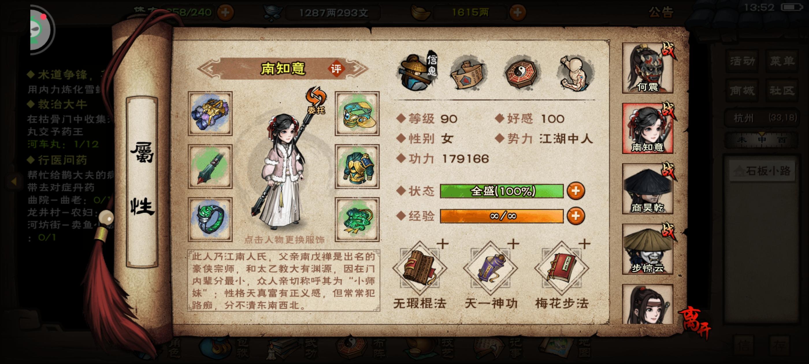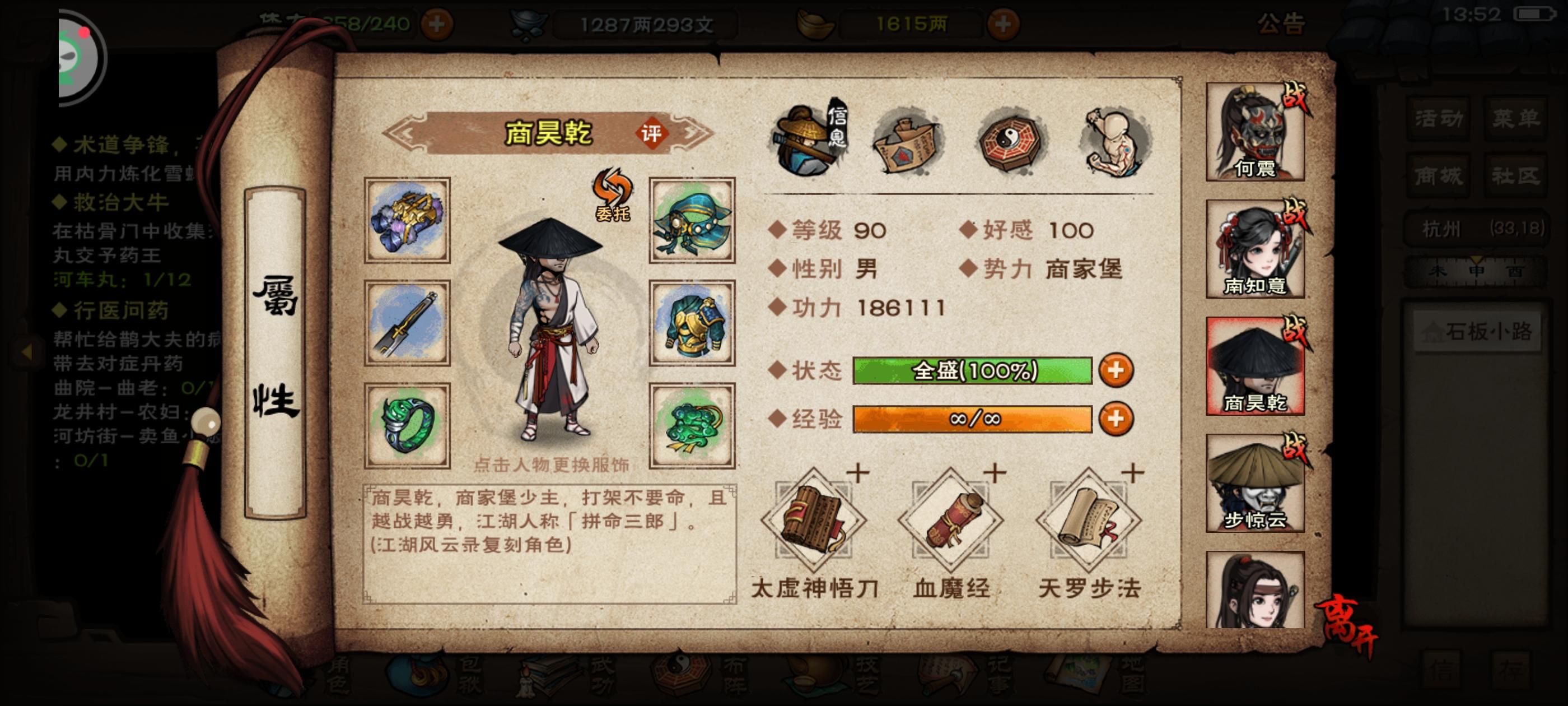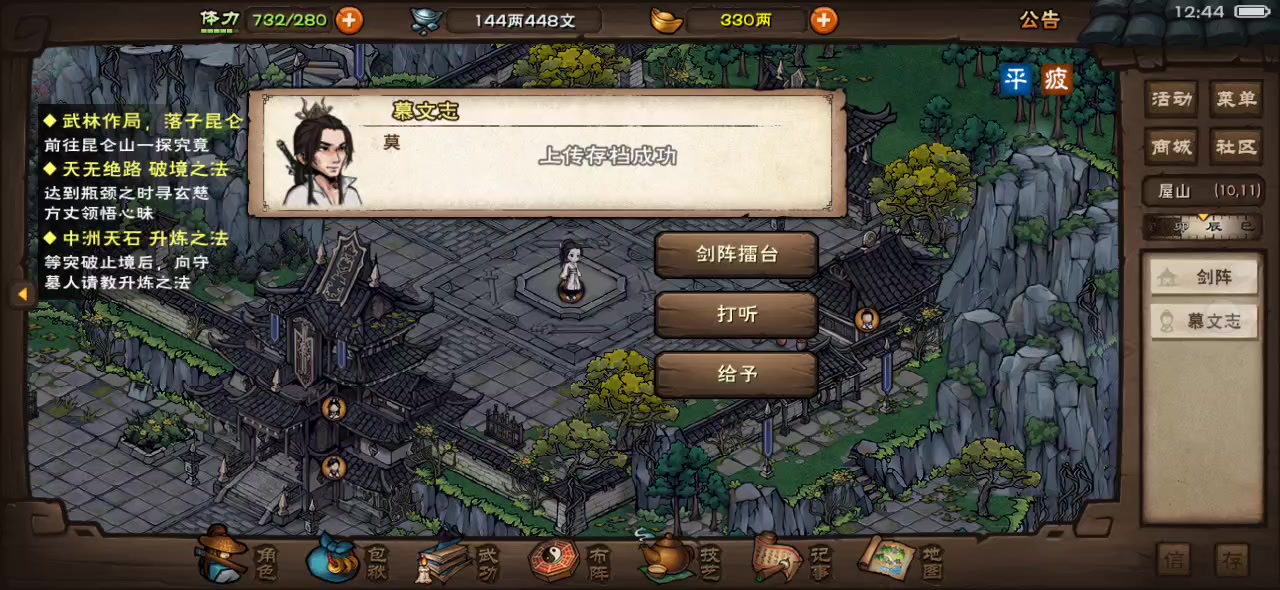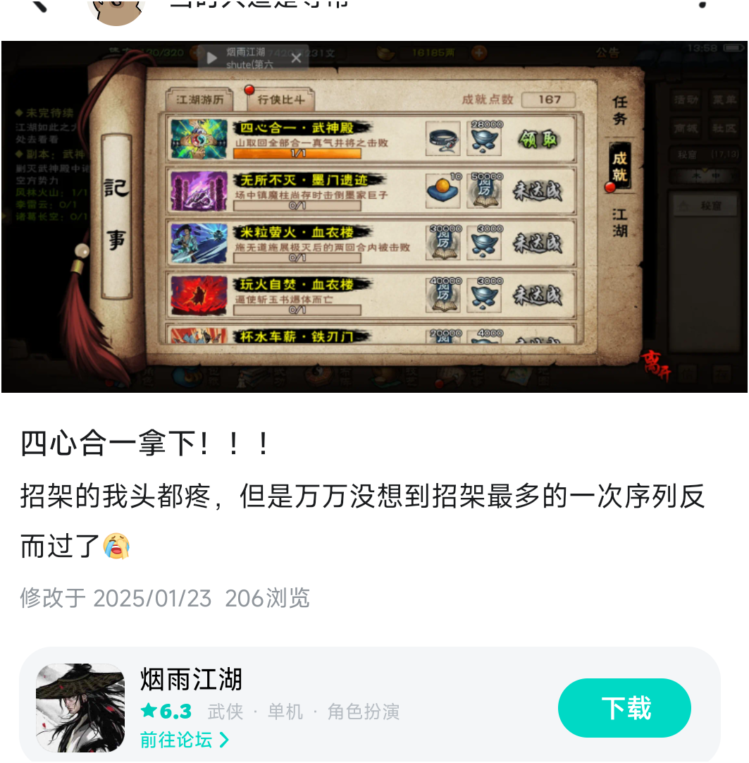 买了个单机版,花了十天时间大概50多个小时通关了一下剧情,只是一路推了主线,没有玩支线,除了救药王那个支线,因为药王不救的话后续主线就请不了樊宇,要是玩支线的话,这游戏的时长还能翻好几倍。 这游戏如果是个买断制单机的话,应该可以仅次于逸剑和大侠,在单机武侠游戏排行榜中列前三。🤔 如果从单机游戏的角度来考虑,缺点也比较明显。 第一点就是剧情是单一线性,主线是一条直线,各种支线对最终结局没有什么