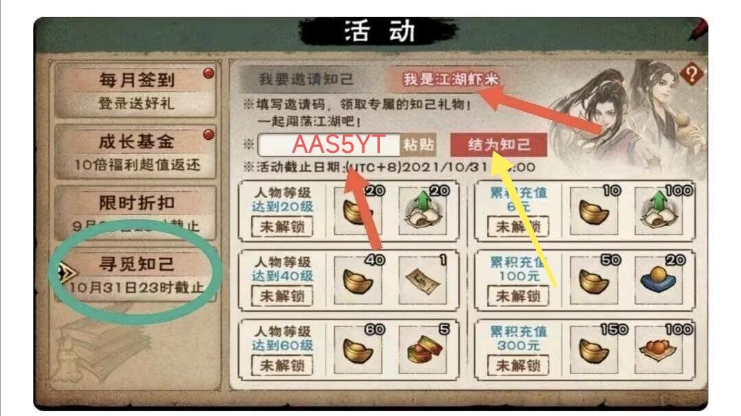 •游戏右上角点开活动,寻觅知己,然后点开我是小虾米,输入邀请码AAS5YT,可获得400元宝+马车票+8万阅历+120体力+100洗髓丹+20顺脉丹。♦︎长期兑换码(一个句号一个蚊子腿,激活时句号,不用输)关注烟雨江湖手游微博。天刀无双。yy1111。yy6666。yy8888。♦︎最新兑换码(有时效性):重振恒山。上红果看烟雨短剧。小寒赏花信。给新手的一些建议1.少林寺童子功尽快拿,加很
