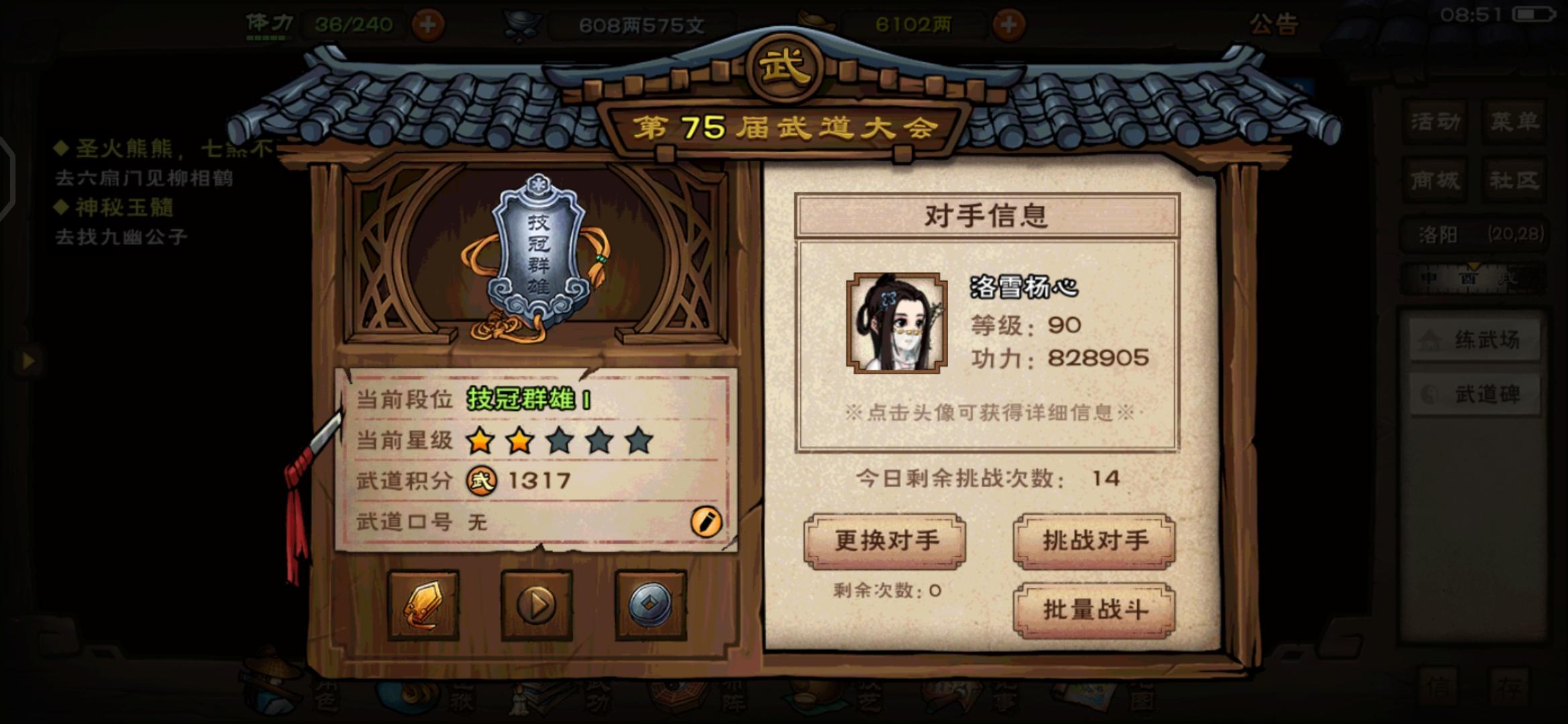 各各各各各位大佬们好好久没汇报和求教了最近一直打墨门(免费一次加刷新一次)为了全图放满采集傀儡也是拼了,目测提升不大血衣楼控制手动技能的话可以稳过老二,不过老三还是有难度,尝试了让他自己爆炸,但还是扛不住他的技能上乘目前主角用的门派的(泠月是真黑啊)随从柳学了伏羲➕元引钟还在为了泣玉和种玉努力苏的话目前打不过血衣楼老三,有点迷茫目前可买和已有的内功百