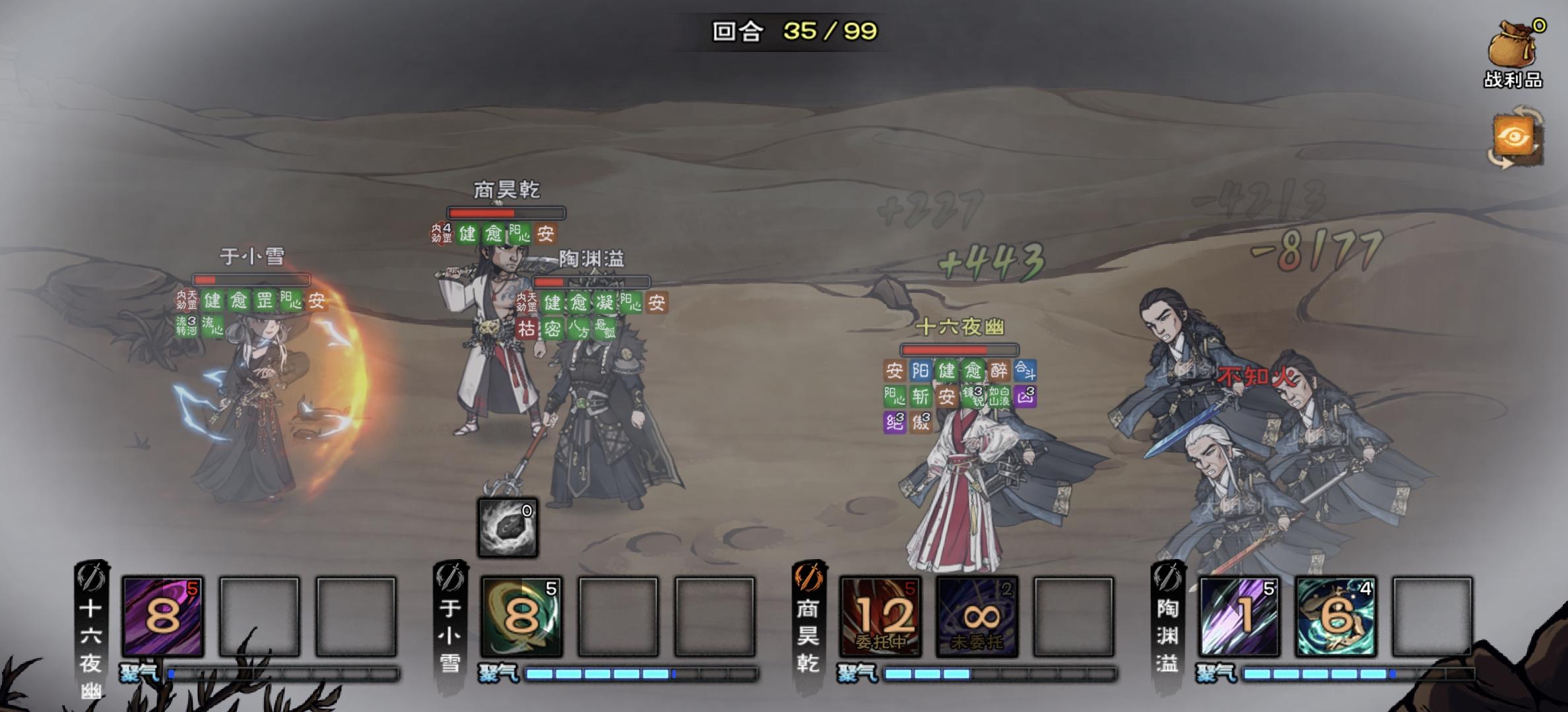 今天把顺脉买了给陶通了个受疗脉,想着去开合道看看,也是过了。面板分别是鬼刀奶指主和三个随从的。四驱硬吃3发合击,毕竟输出太低了。小李子算是最简单的了,唯一需要注意的是控伤害不能把他秒了。剑阵不想用叮叮当当剑,选择了无敌鬼刀。虽然演员鬼刀天天断buff,但是打起来还是挺舒服的,主要是天一长生都在陶身上导致生存有时候会不够。最后控伤害太难了(游走这一块),只能选择全杀了
