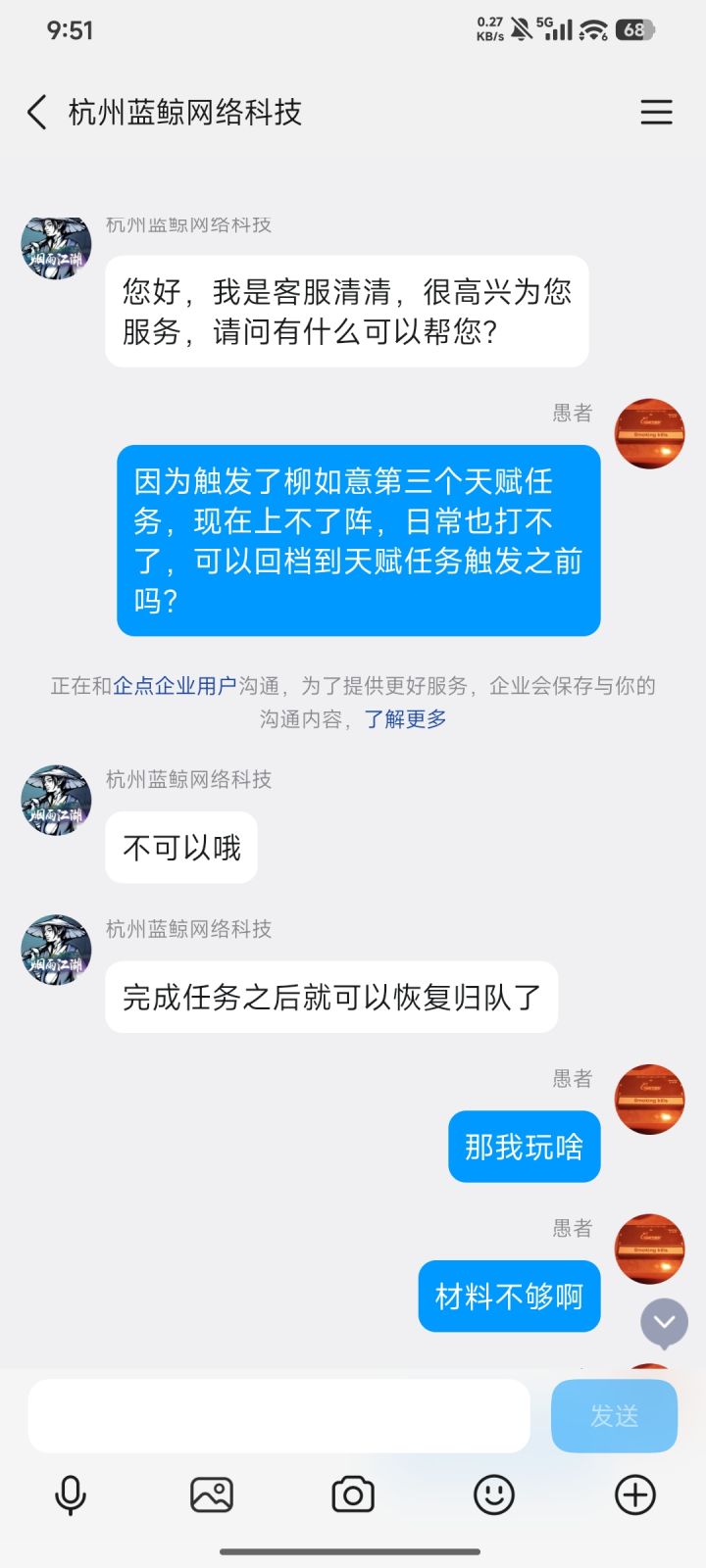 因为触发柳如意的第三个天赋任务,材料不够完成不了天赋任务,也打不了日常,重新培养一个主角都67级也来不及了,然后蓝鲸客服就说不行,但是我又没开过挂我从44区开始玩的24年入的坑,现在真的后悔了不该玩这个的,出了事客服不理不解决那我为什么还要充钱呢?