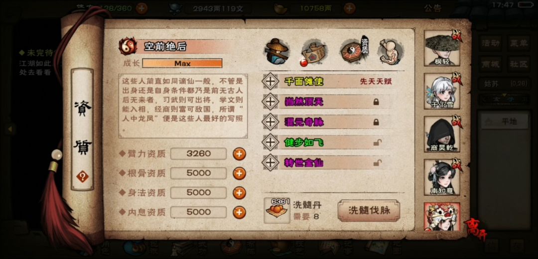 我感觉老商越来越不好出伤害,但是老步我又没什么资源培养,他要培养的话又得等很久,但是我现在正好卡bug时间很够,我在想要不要退出极乐谷先去天刀,把所有的秘籍跟天刀学完,再等三个月回极乐过碧游,因为我发现我的随从和主角玩刀什么秘籍都没有。